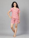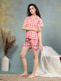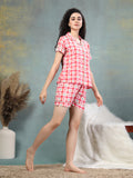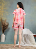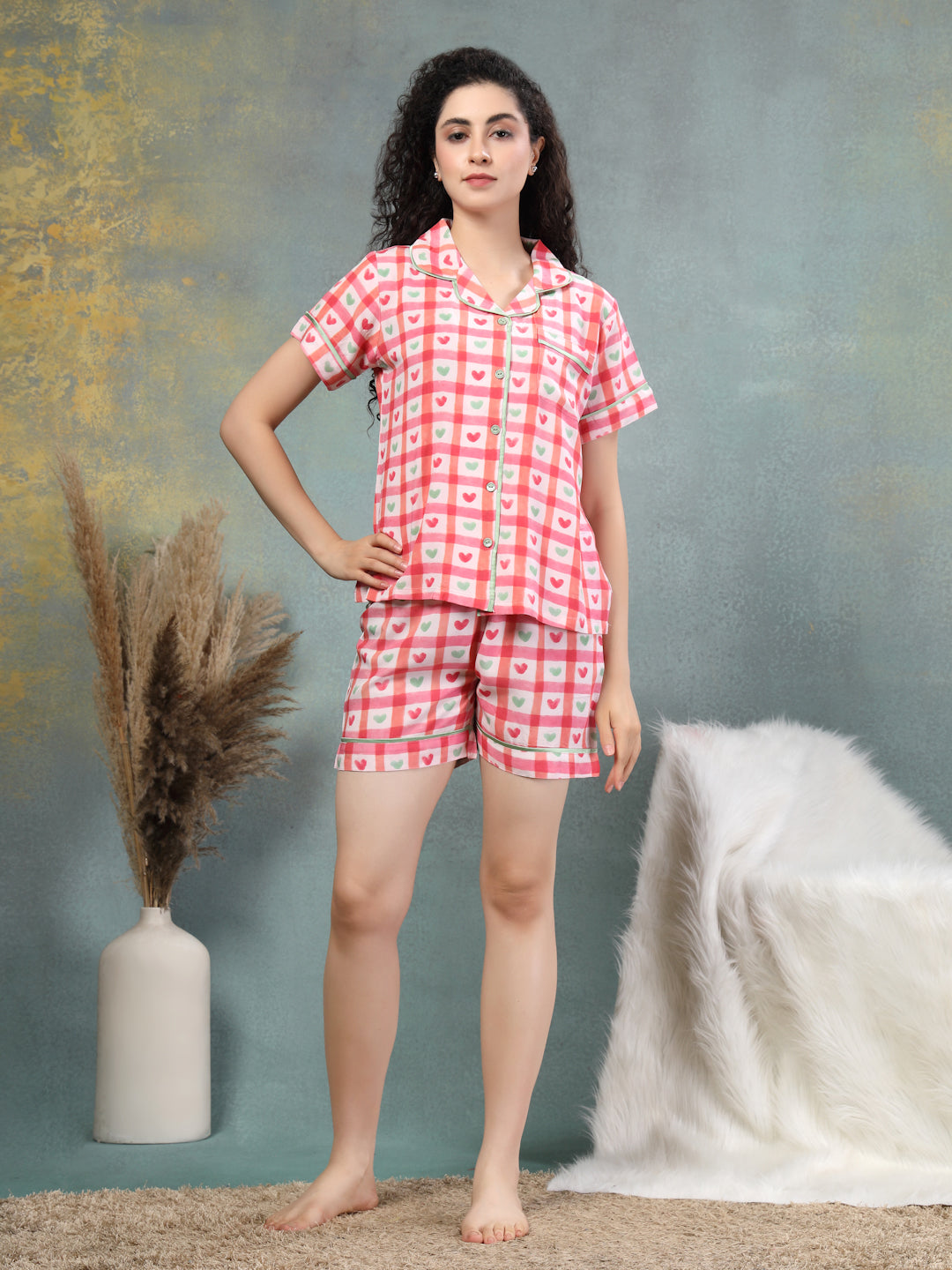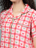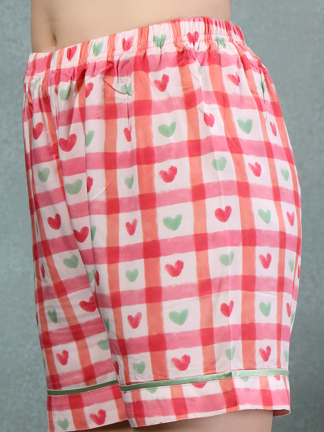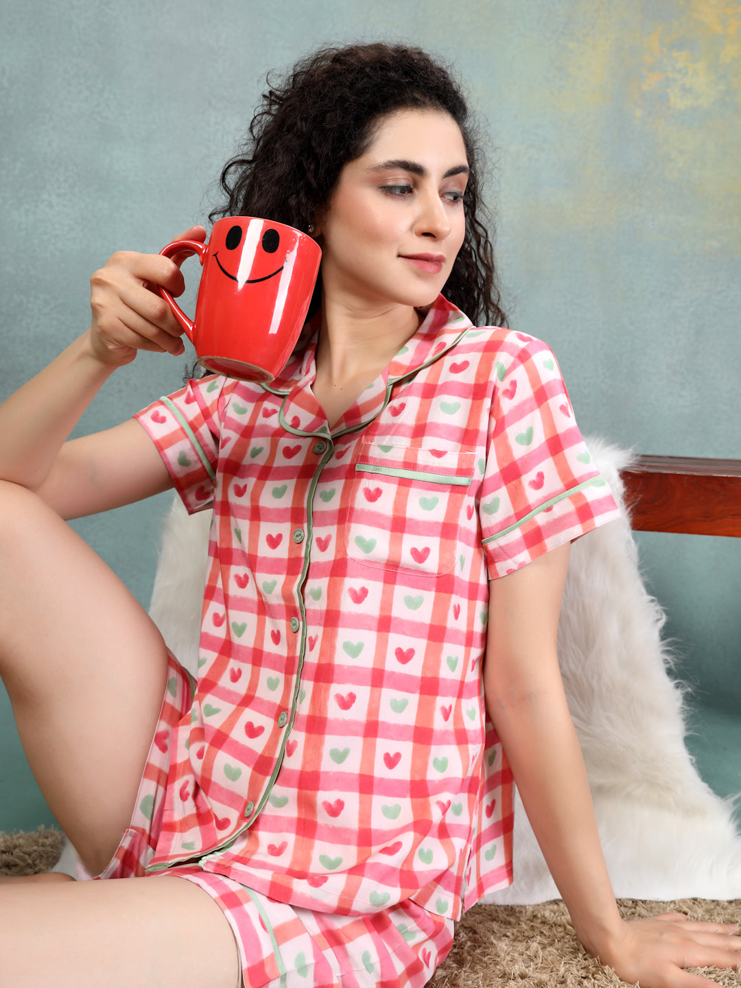 Made from soft, breathable viscose fabric, it ensures a cool and lightweight feel throughout the warmer months. The material is known for its superior comfort, making it an excellent choice for relaxing at home. The set features a vibrant red and pink checkered pattern adorned with heart motifs in contrasting shades, giving it a cute and cheerful aesthetic. This set brings a refined ease to your downtime, with a subtle nod to style.
