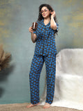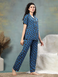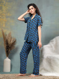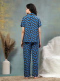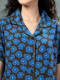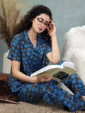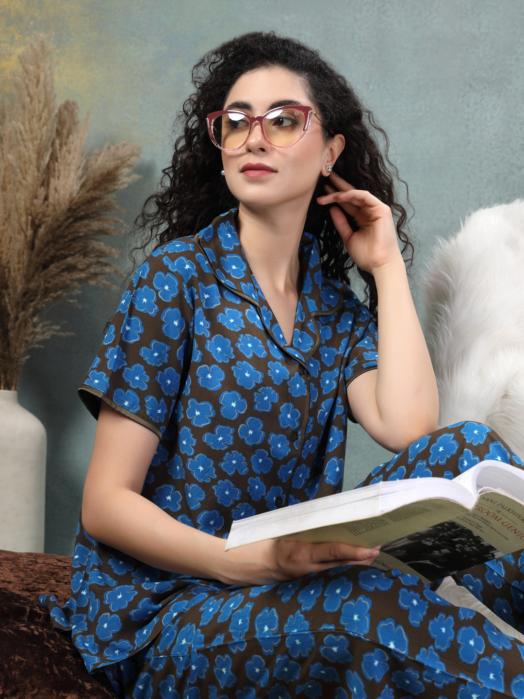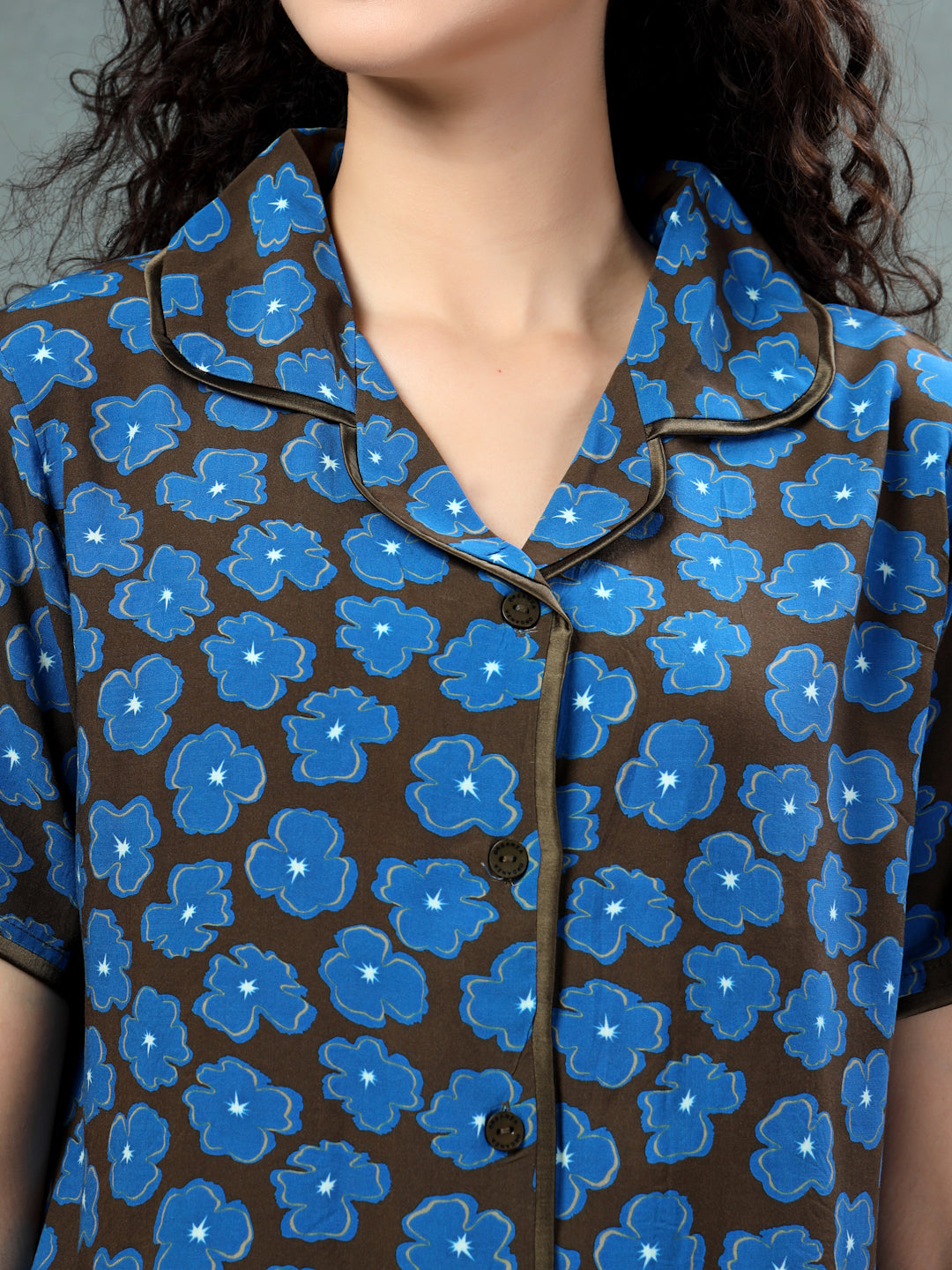 Made from breathable, skin-soothing viscose fabric, it’s perfect for lounging through the dummer heat. The short-sleeved shirt features a notched collar and contrast piping for a tailored yet relaxed look. Thoughtfully finished with pockets on both sides, it's as practical as it is playful. Drift into comfort with this blue floral printed nightsuit set, designed to bring cheer and charm to your evenings in. This set brings a refined ease to your downtime, with a subtle nod to style.