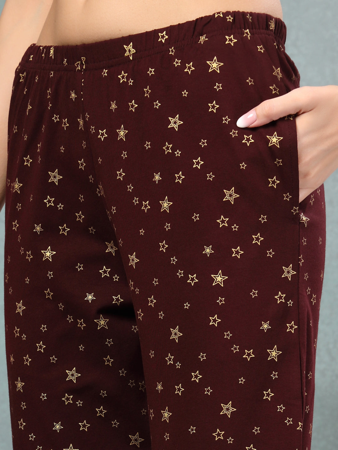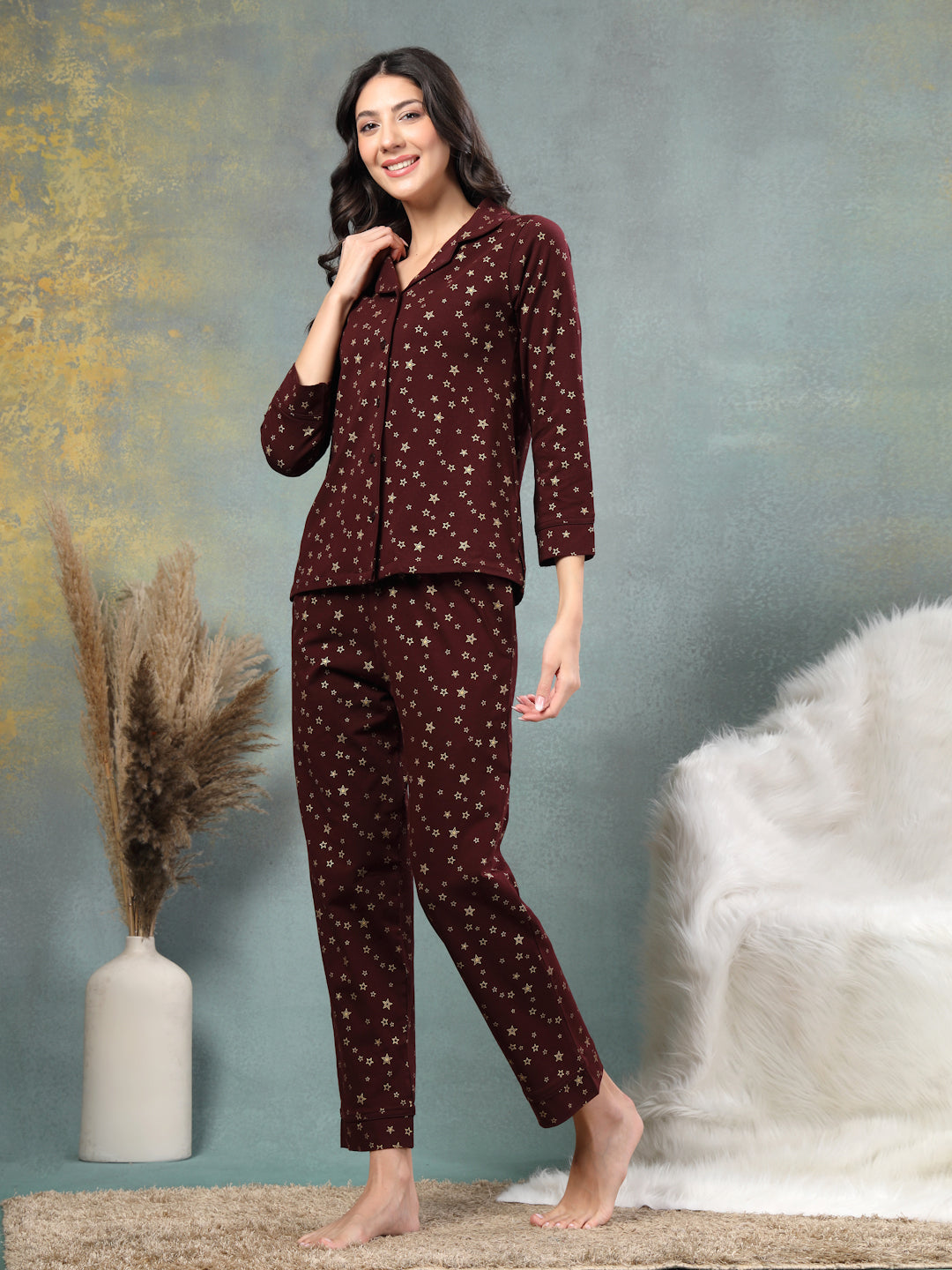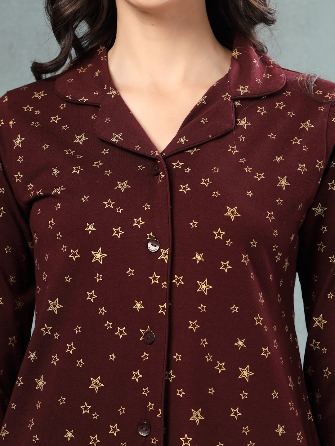 The soft cotton lycra blend gives you a gentle stretch with a smooth feel that moves effortlessly with your day. The button-down top adds a classic touch, while the two side pockets keep it practical for lounging or unwinding. This maroon night suit with golden star prints isn't just for bedtime, it's made for slow mornings, cozy afternoons, and everything in between. It offers a gentle embrace for evenings and mornings, balancing softness with quiet elegance.