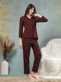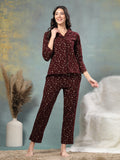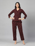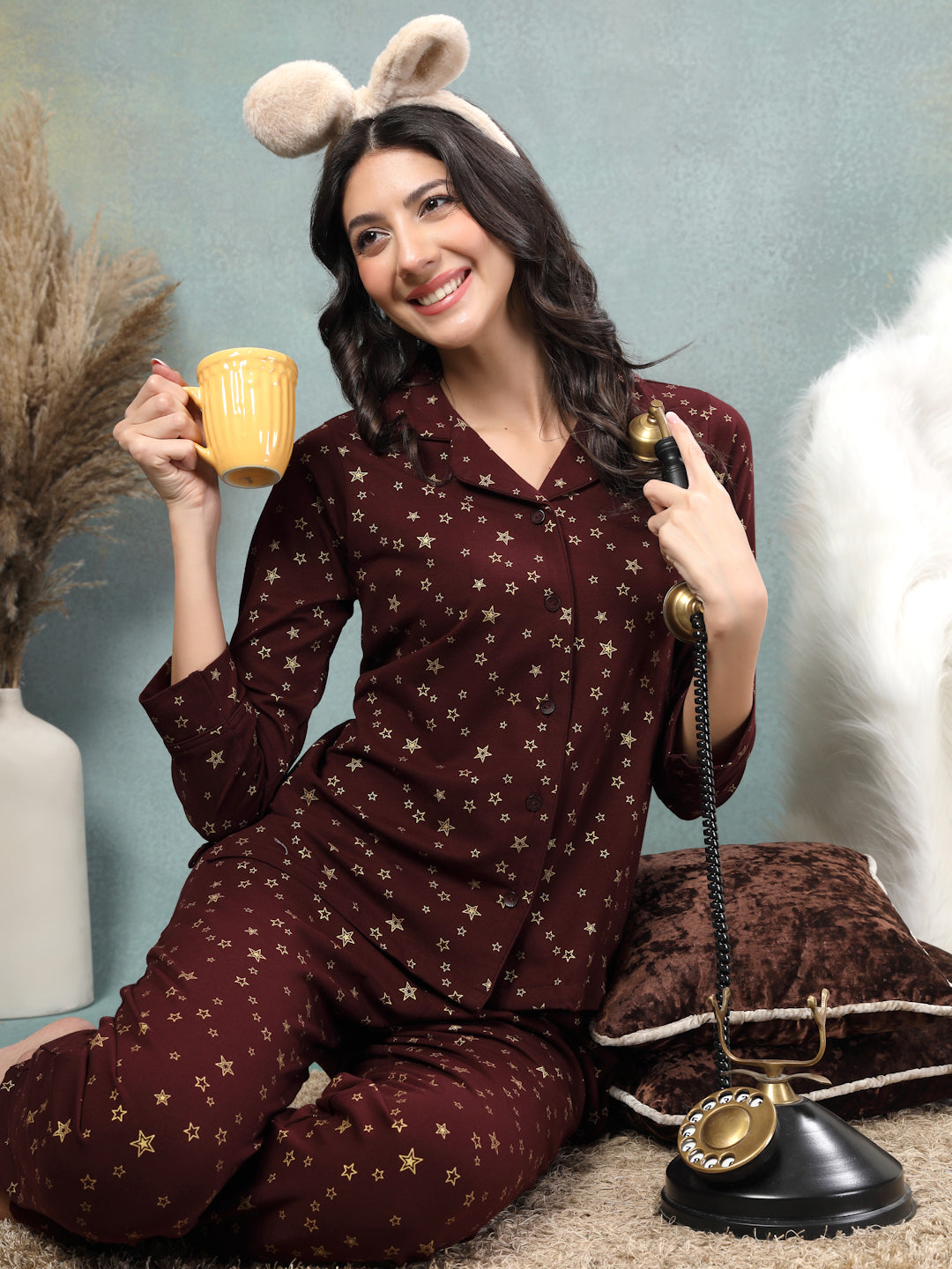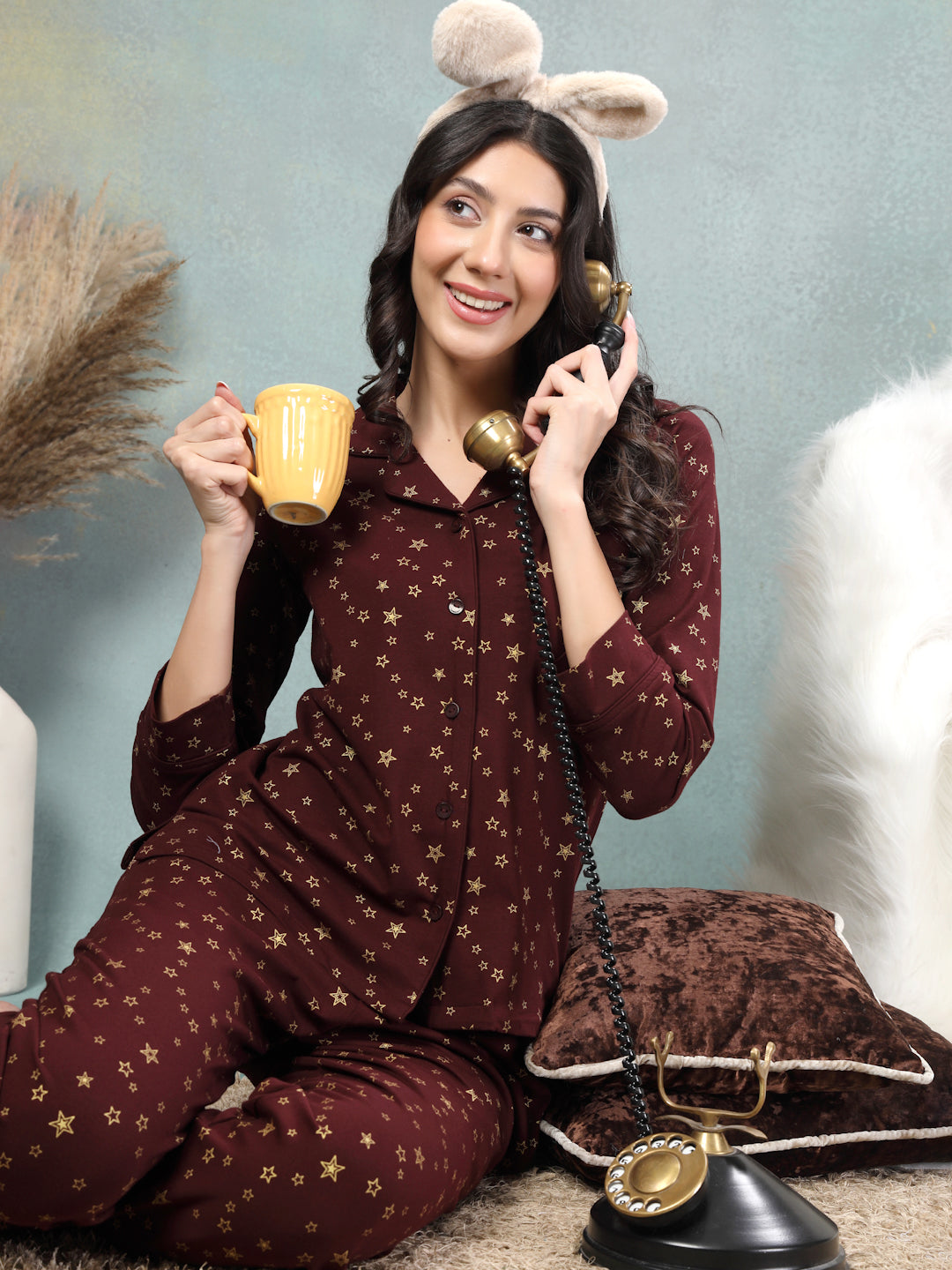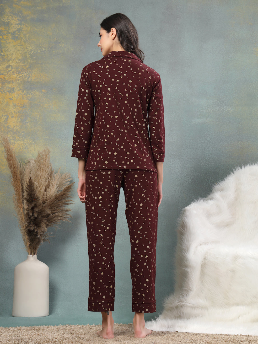 The soft cotton lycra blend gives you a gentle stretch with a smooth feel that moves effortlessly with your day. The button-down top adds a classic touch, while the two side pockets keep it practical for lounging or unwinding. This maroon night suit with golden star prints isn't just for bedtime, it's made for slow mornings, cozy afternoons, and everything in between. It offers a gentle embrace for evenings and mornings, balancing softness with quiet elegance.
