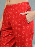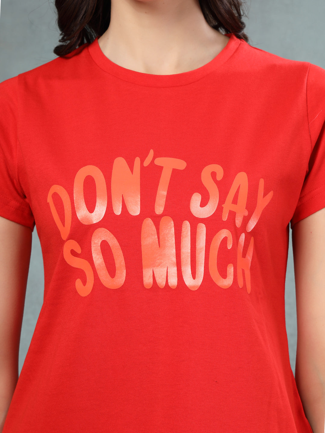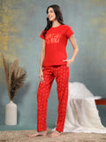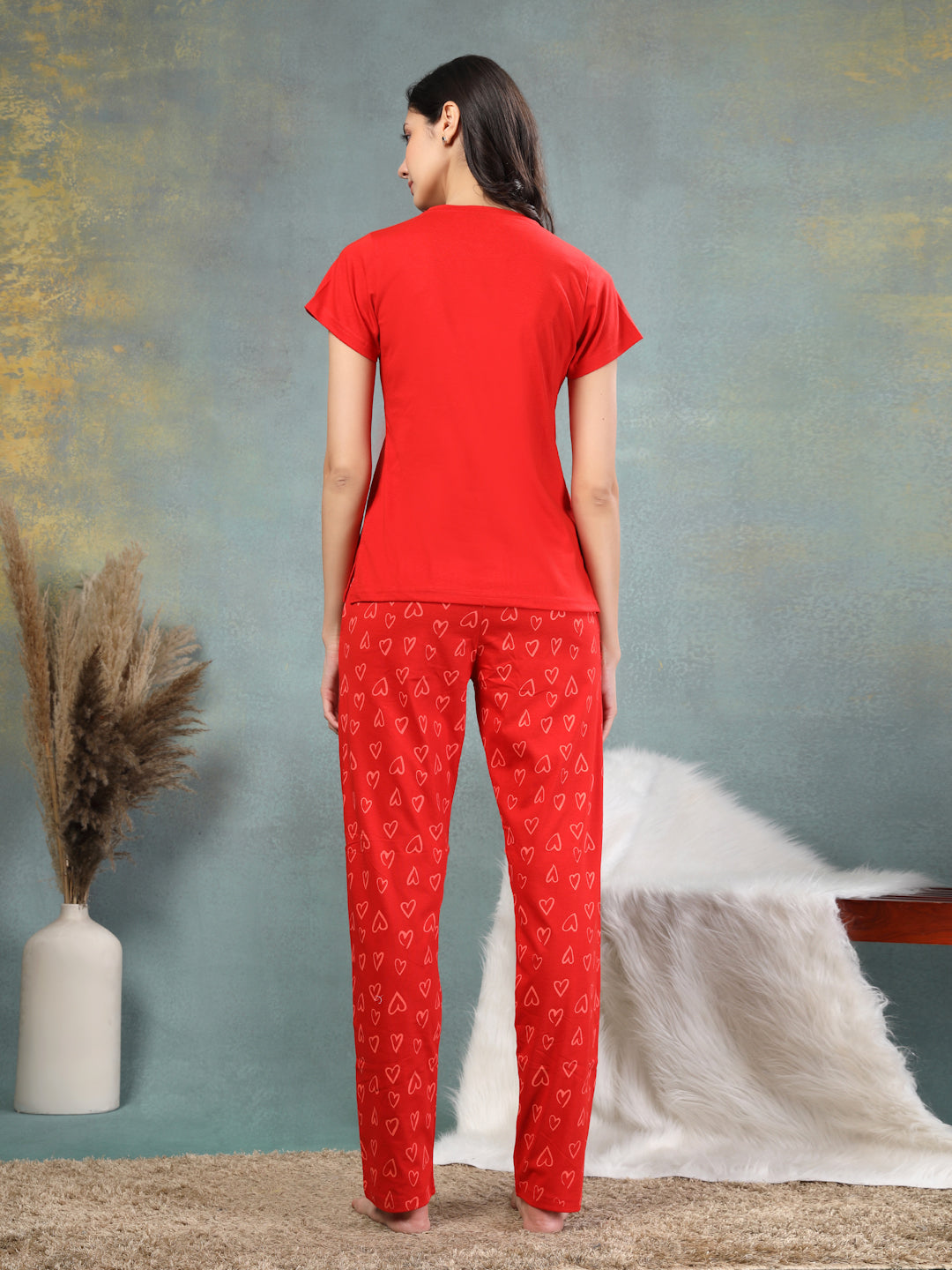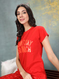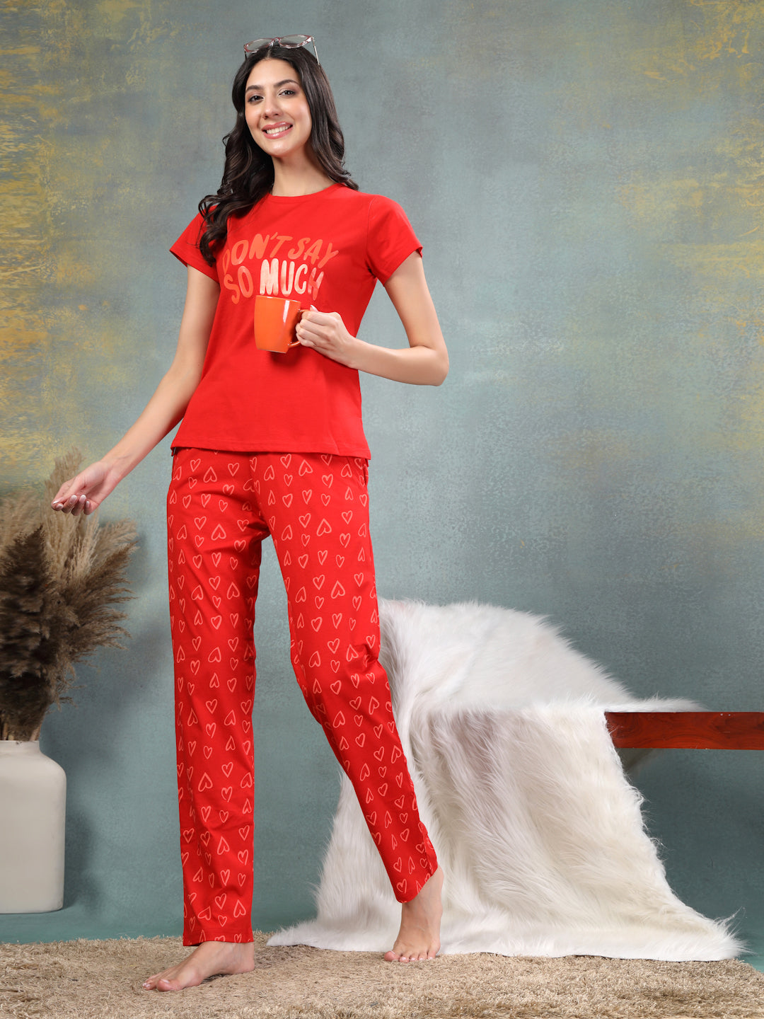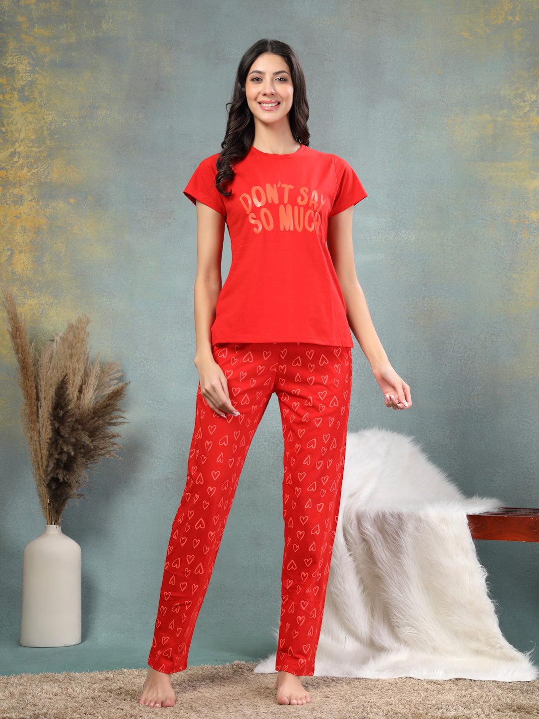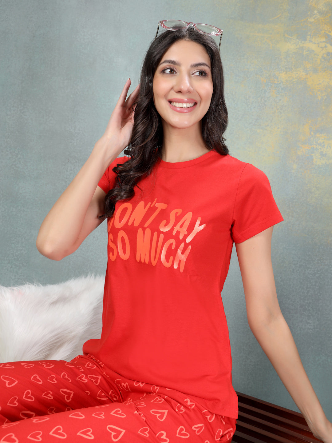 Add a pop of playful charm to your summer nights with this vibrant cotton-rich night suit set. The set features a bold red top with a fun printed message that adds personality and cheer to your downtime. Thoughtfully designed with two convenient pockets in the lower, it blends practicality with style. It offers a gentle embrace for evenings and mornings, balancing softness with quiet elegance. Gentle comfort meets subtle elegance.