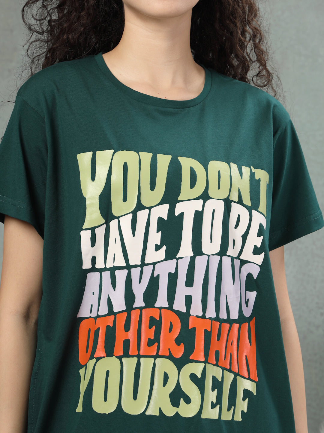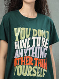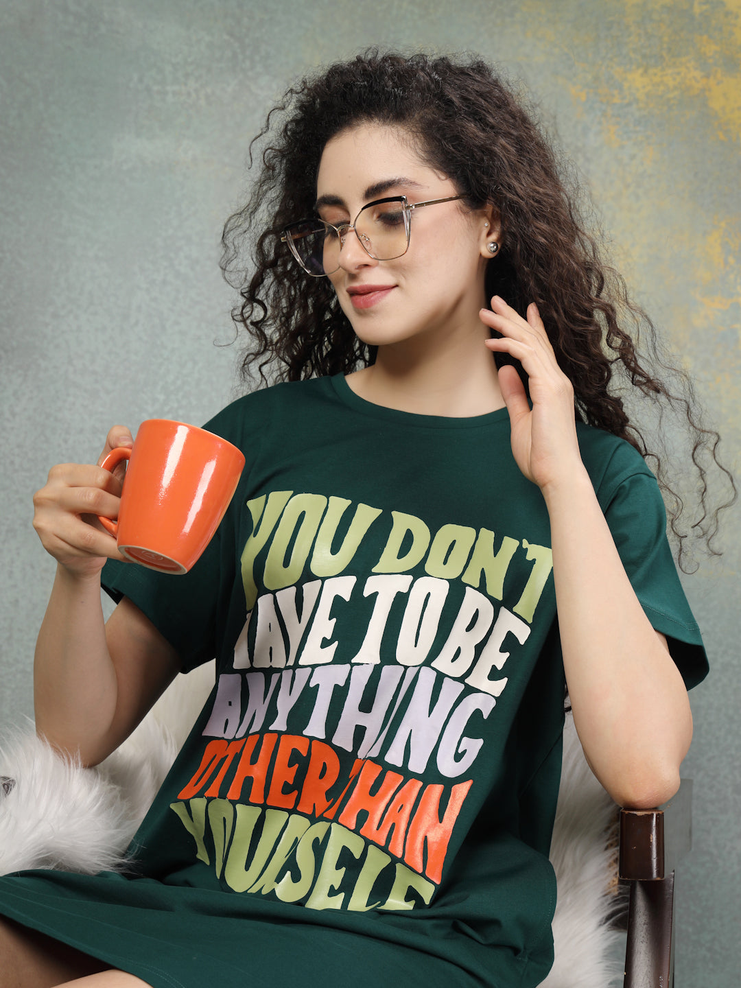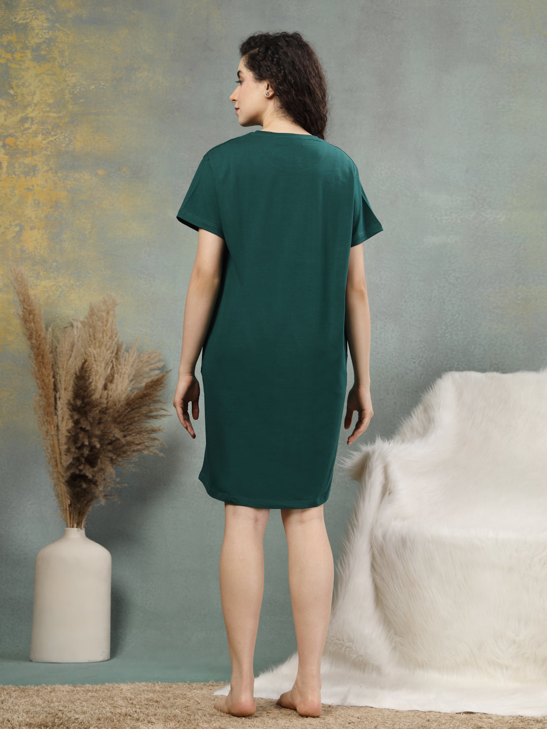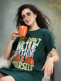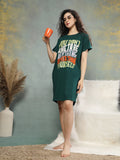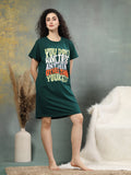 Dressed in a rich forest green with a bold multicolour quote, it’s made to celebrate your unapologetic self. Crafted from soft cotton lycra, it has the perfect stretch for all-day ease. The relaxed shape gives you room to breathe, while side pockets add a touch of function without compromising on style. It offers a gentle embrace for evenings and mornings, balancing softness with quiet elegance. Confidence looks good on you, and this night shirt makes it feel even better.