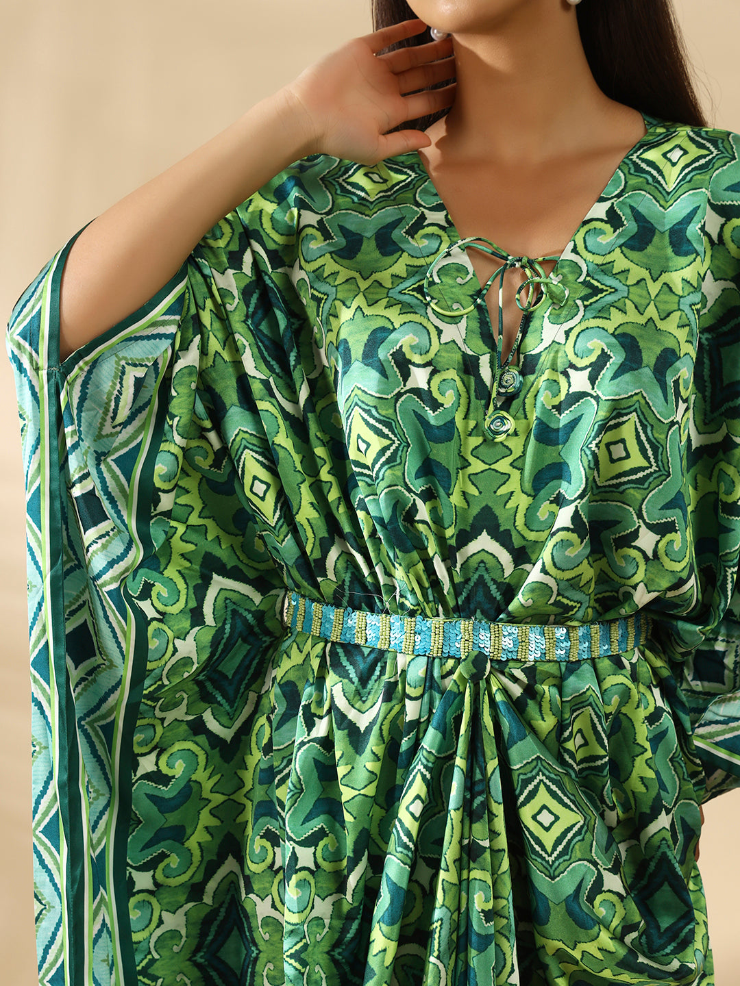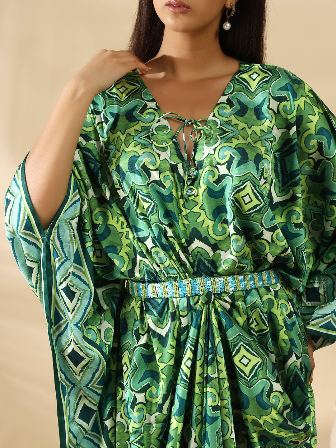 Some outfits whisper comfort while making a quiet statement, and this satin kaftan dress does exactly that. Made from smooth, skin-loving satin, this dress offers a lightweight touch that feels barely there, with enough drape to create movement and flow. The structured print panels give it a tailored visual rhythm while the wide sleeves and adjustable waist keep it relaxed and wearable. The result is a harmonious blend of comfort and design, made for savoring life's simple moments.