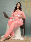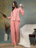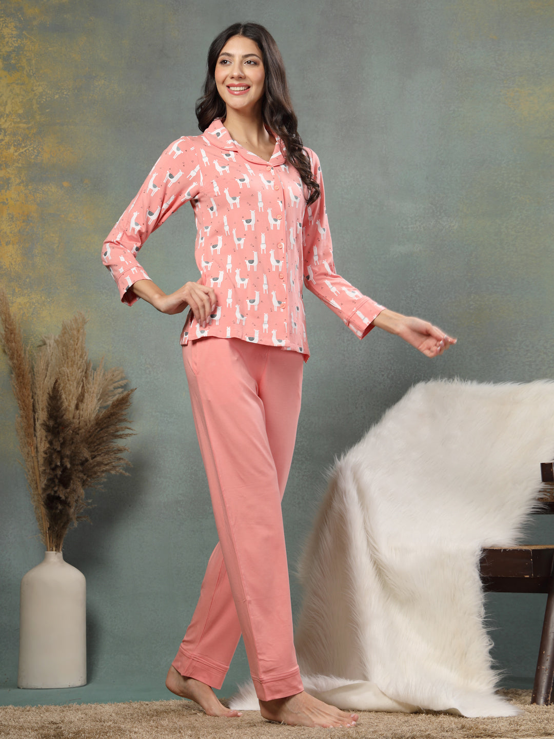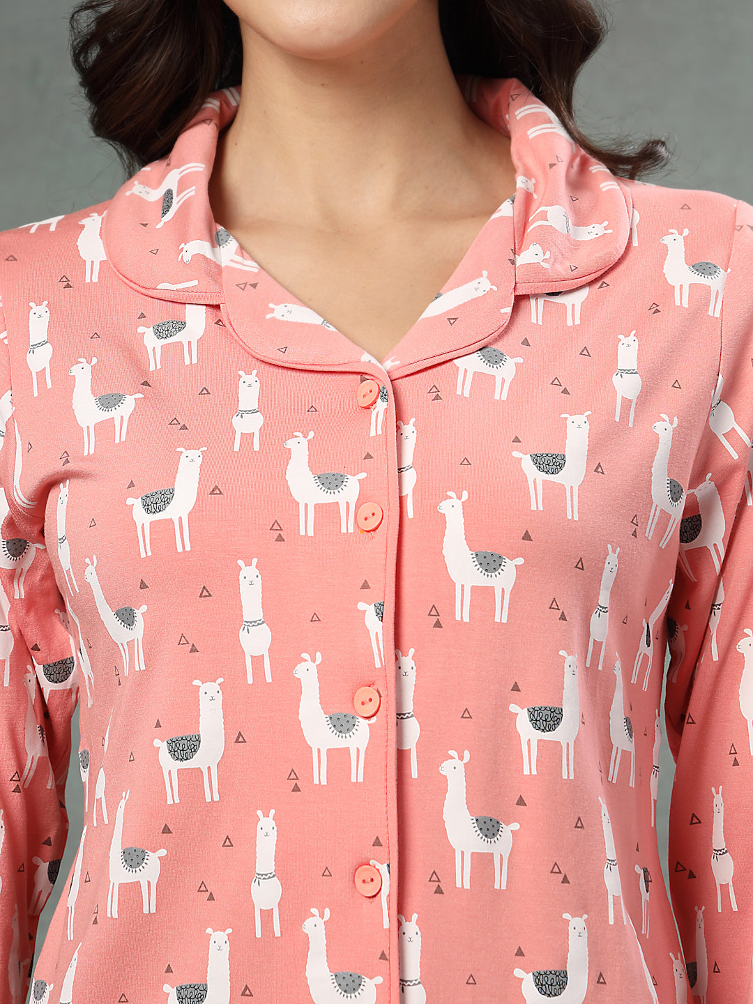 Make every moment at home feel like a retreat with this cheerful llama-print night suit, crafted from stretchable lycra cotton for a soft and flexible fit. The fabric glides over the skin while keeping you comfortable through every season. The full-sleeve shirt features a gentle rounded collar and front button closure for an easygoing silhouette. This set brings a refined ease to your downtime, with a subtle nod to style.