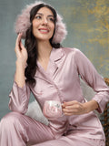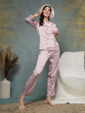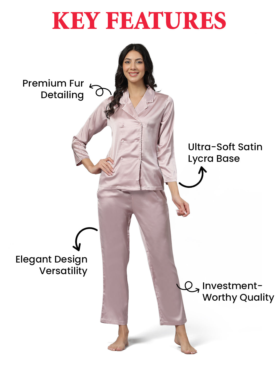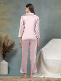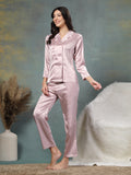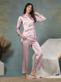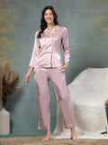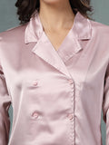 Sophisticated and silky, this satin co-ord set is your invitation to unwind with elegance. Designed with a unique double-breasted silhouette, the top brings a touch of tailored charm to your everyday lounge look, while the smooth satin fabric wraps you in lightweight comfort. Full-length pants offer a relaxed fit and come with two practical pockets, perfect for slipping in essentials as you move through your day. Softness meets style for everyday ease.