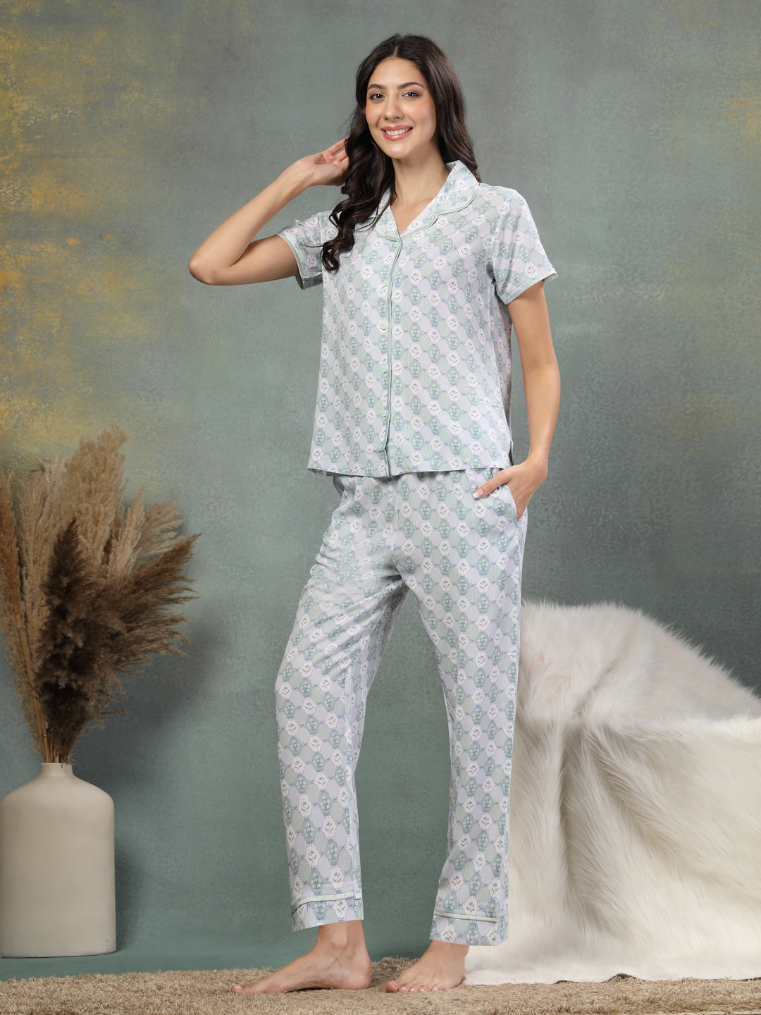The short-sleeved, button-down top pairs effortlessly with relaxed fit bottoms, making it perfect for warm weather. Crafted in breathable fabric and featuring two handy pockets in the lower, this set is as functional as it is stylish. The cheerful all-over print and subtle matching piping add a touch of fun to your everyday routine. It offers a gentle embrace for evenings and mornings, balancing softness with quiet elegance. Gentle comfort meets subtle elegance.