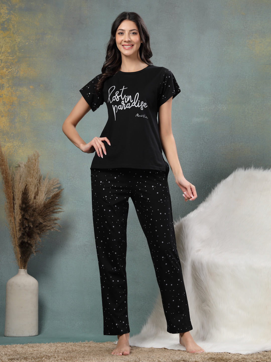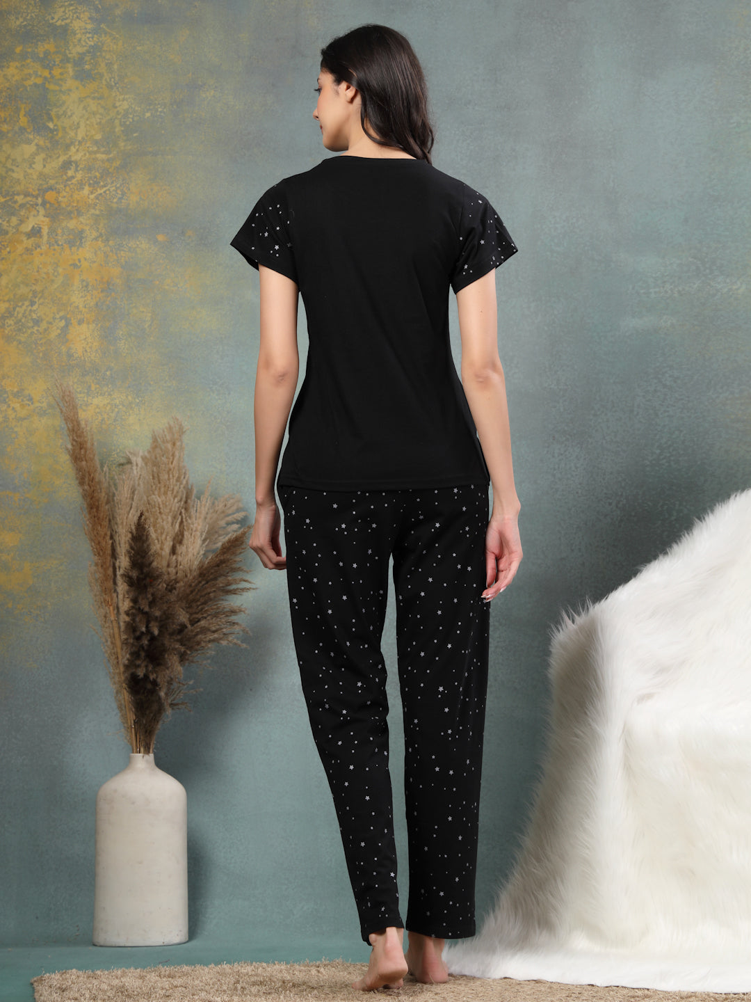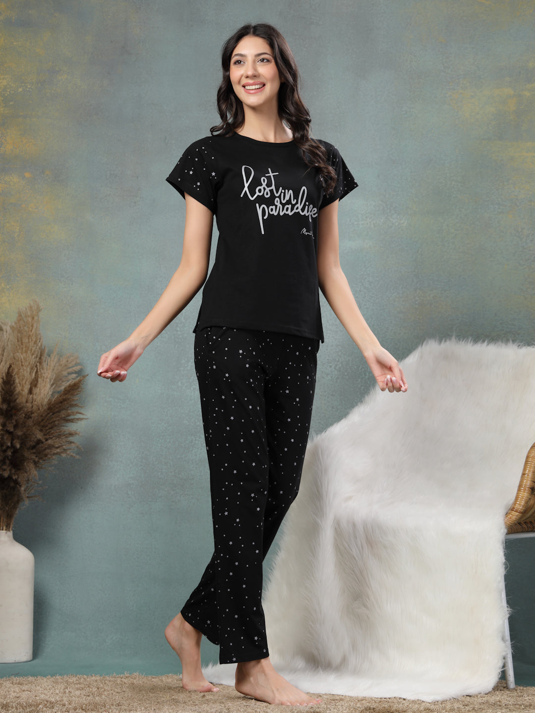 Made for summer nights but cool enough to wear when you're pretending to clean and actually just vibing, it features two handy pockets for secrets, snacks, or stashing your phone during “just one more episode.” Basically: it's not just a night suit. Who says nightwear can't have a little main character energy? It offers a gentle embrace for evenings and mornings, balancing softness with quiet elegance. This all-black set isn’t just soft and breathable; it’s an attitude.