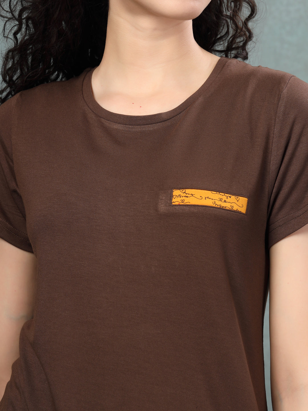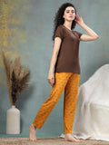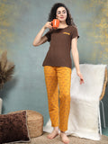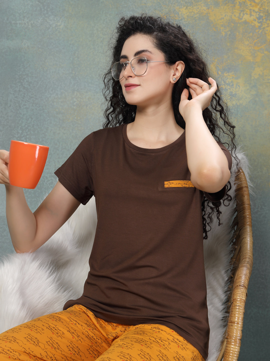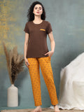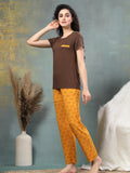 Crafted from a cotton-lycra blend, this night suit is made for movement and relaxation. The rich chocolate brown top is complemented by cheerful script-print orange bottoms, creating a vibrant yet cozy combination. Thanks to its modal-enhanced fabric, the set offers a soft touch and excellent stretch for all-day comfort. Ideal for both lounging and sleep, it's your go-to for a breathable, summer-friendly fit. It offers a gentle embrace for evenings and mornings, balancing softness with quiet elegance.