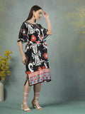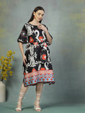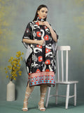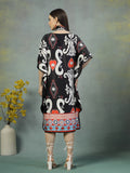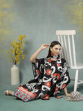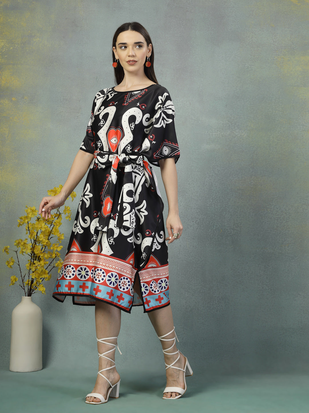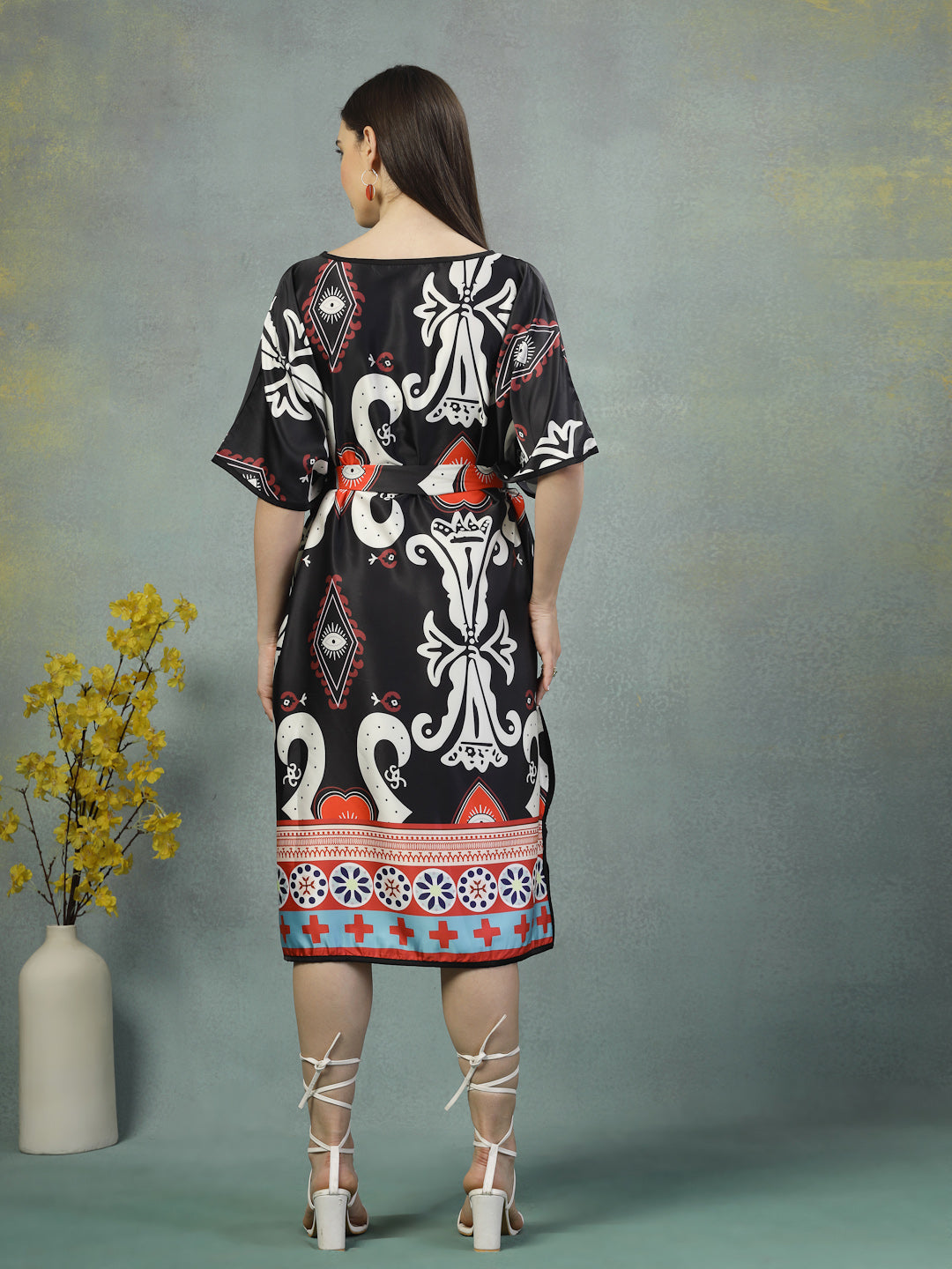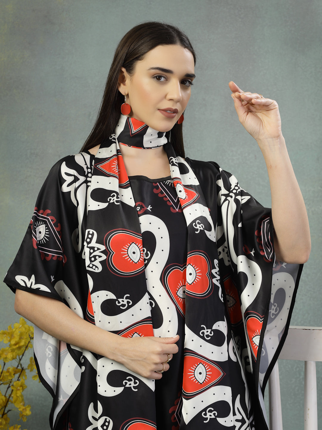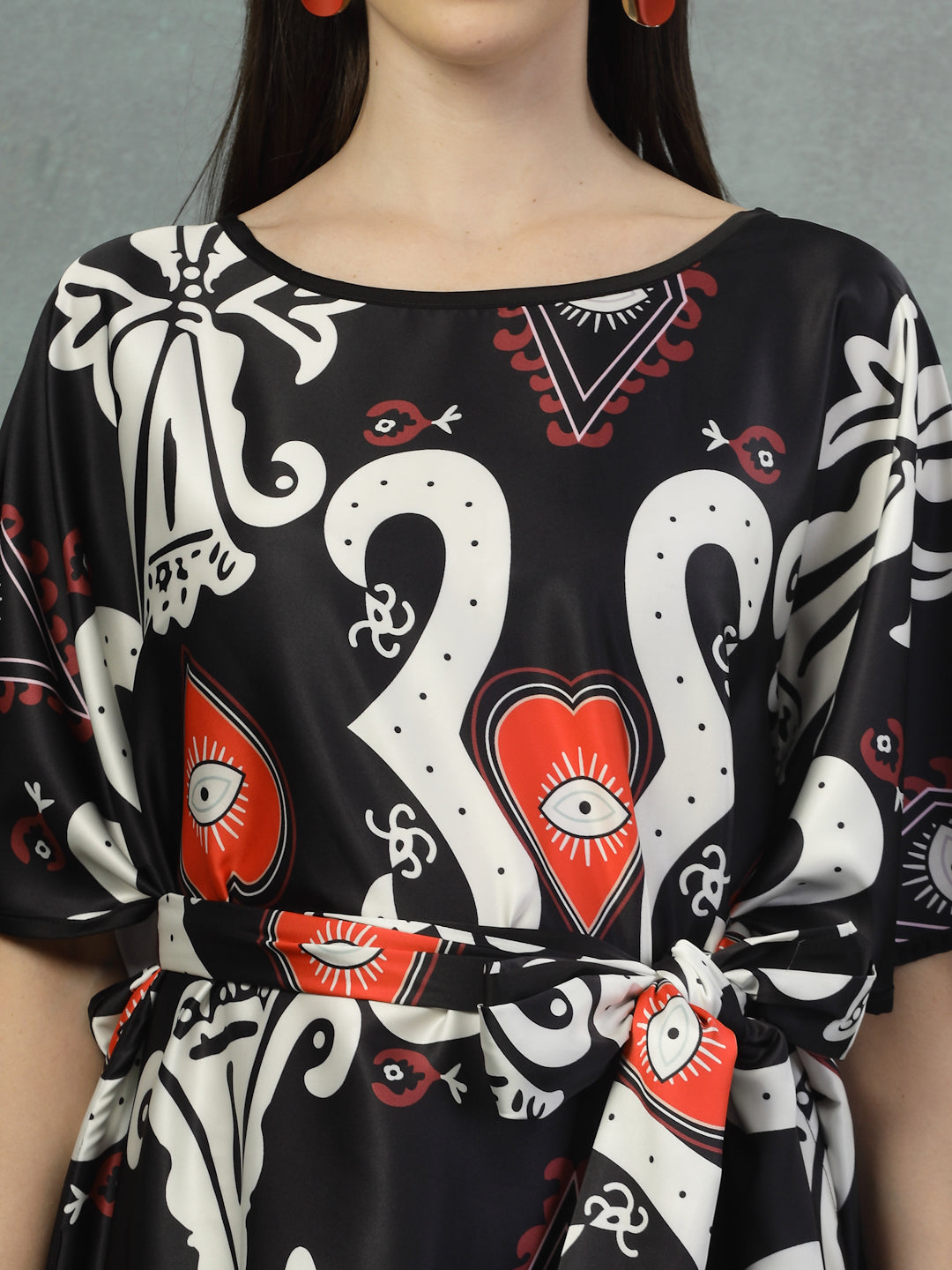 Command attention and comfort in this statement-making kaftan dress, crafted in fluid satin lycra. The luxe fabric drapes effortlessly, giving you a silhouette that feels as easy as it looks stunning. Adorned with a vivid, artistic print in striking hues of black, red, and turquoise, this all-season piece brings drama and softness together in perfect harmony. The result is a harmonious blend of comfort and design, made for savoring life's simple moments.