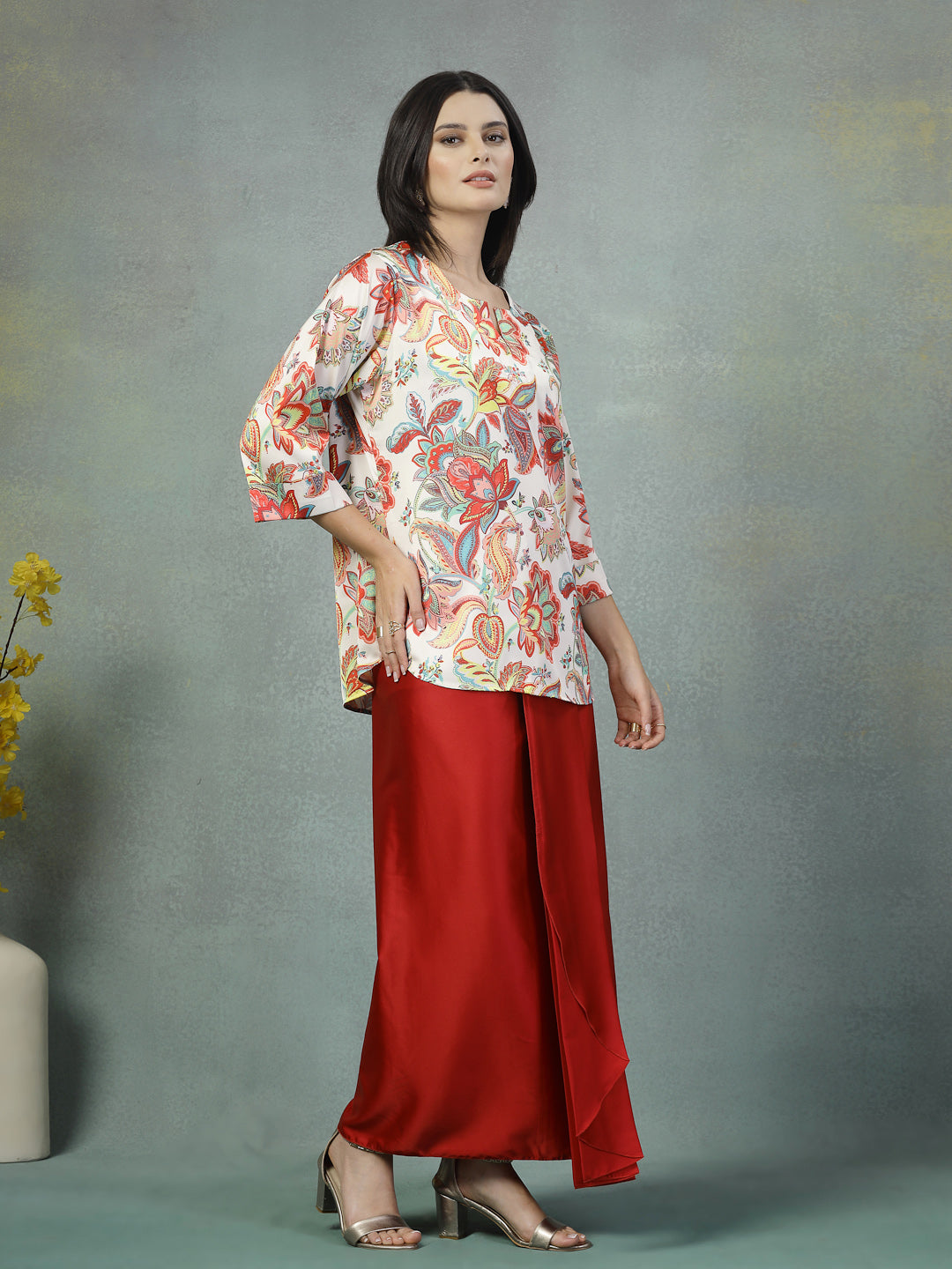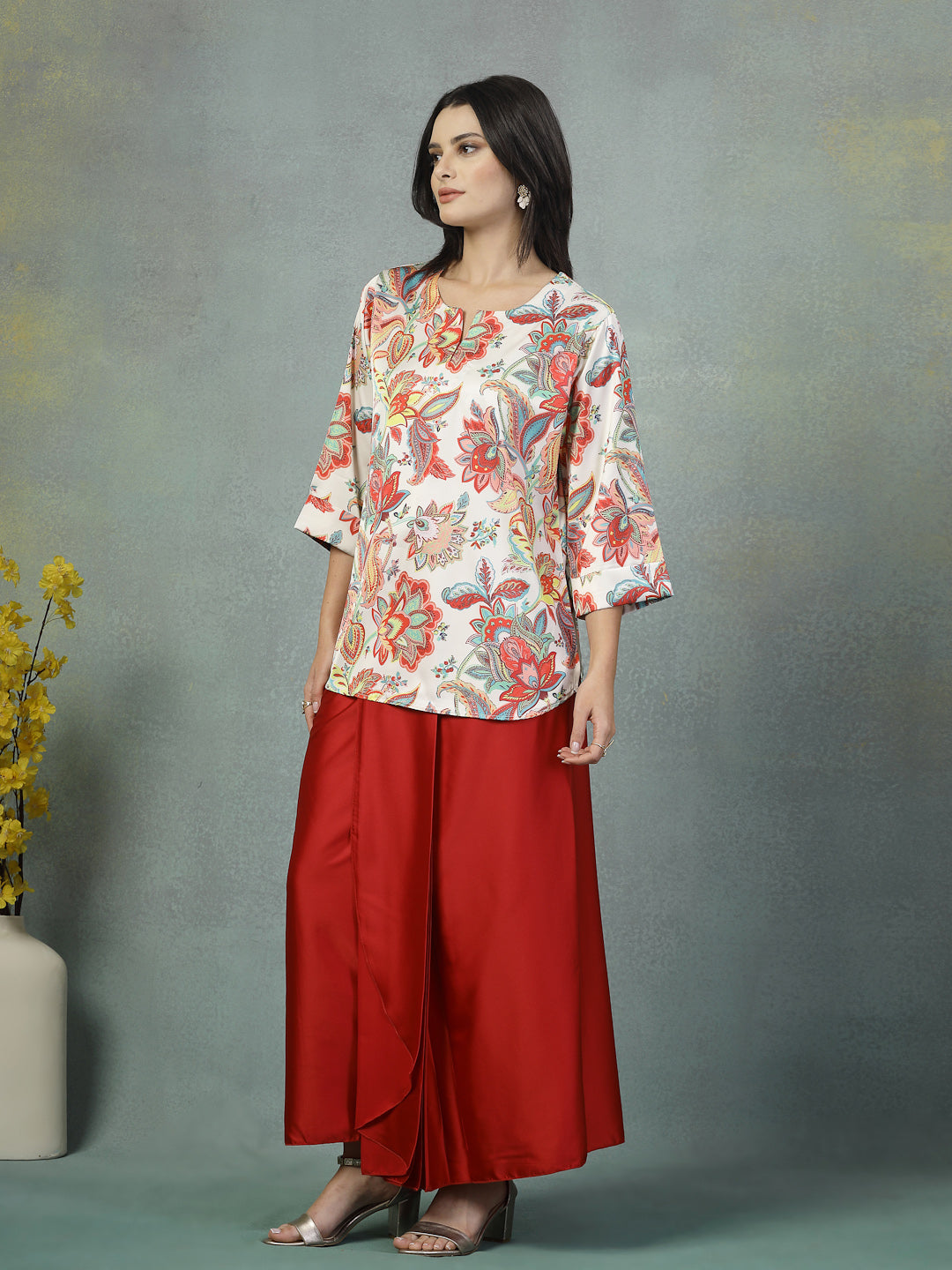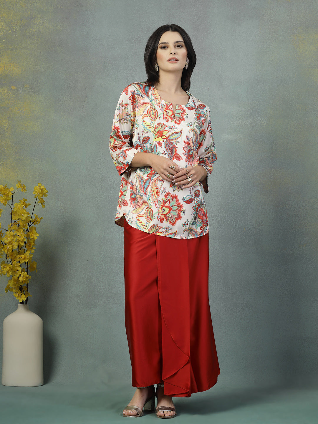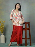 This 2-piece set features a short kurta with intricate designs, paired with a pre-stitched dhoti that creates a flowing, flattering silhouette. The lustrous satin fabric glides against the skin, offering a lightweight, breathable feel that’s ideal for both loungewear and sleepwear. A comfortable round neckline and subtle gathers at the waist add a unique charm, making this set perfect for relaxed evenings, festive gatherings, or intimate dinners at home. Softness meets style for everyday ease.
