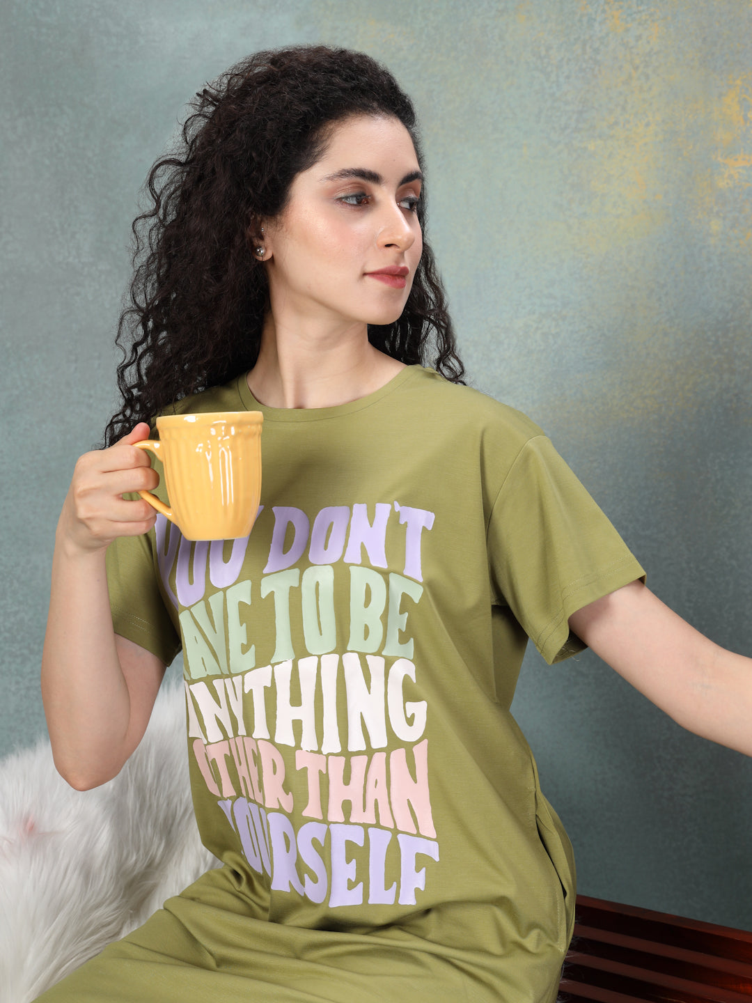 Discreet pockets on both sides bring practicality to the design, perfect for slipping in small essentials. Light, breathable, and thoughtfully designed, it’s your everyday essential for all-season ease. The relaxed fit drapes gently over the body, offering unrestricted movement and daylong comfort. Cheerful multicolored typography at the front adds a pop of personality to your downtime wardrobe. It offers a gentle embrace for evenings and mornings, balancing softness with quiet elegance.