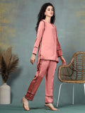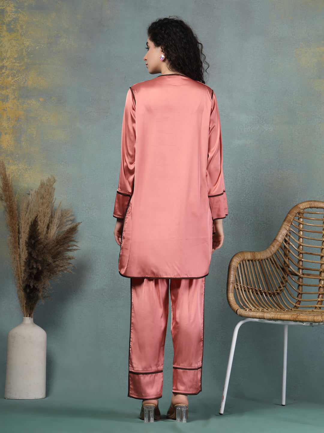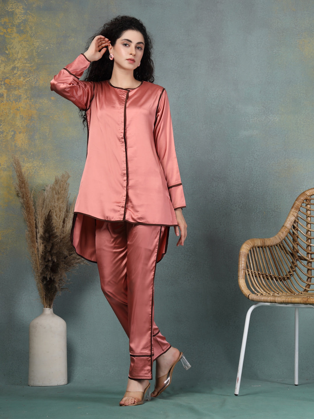 Sometimes, it’s just a satin co-ord set and a mood. The longline top flows with drama while the tapered bottoms keep it polished. And yes, it has pockets. Stepping into luxury doesn’t require an event. This set brings a refined ease to your downtime, with a subtle nod to style. With a rose-gold sheen that catches the light and contrast piping that adds just the right edge, this ensemble is all about quiet power.