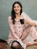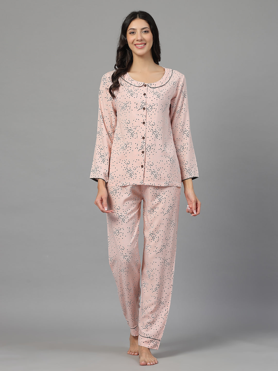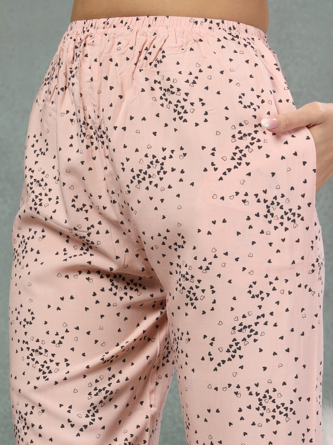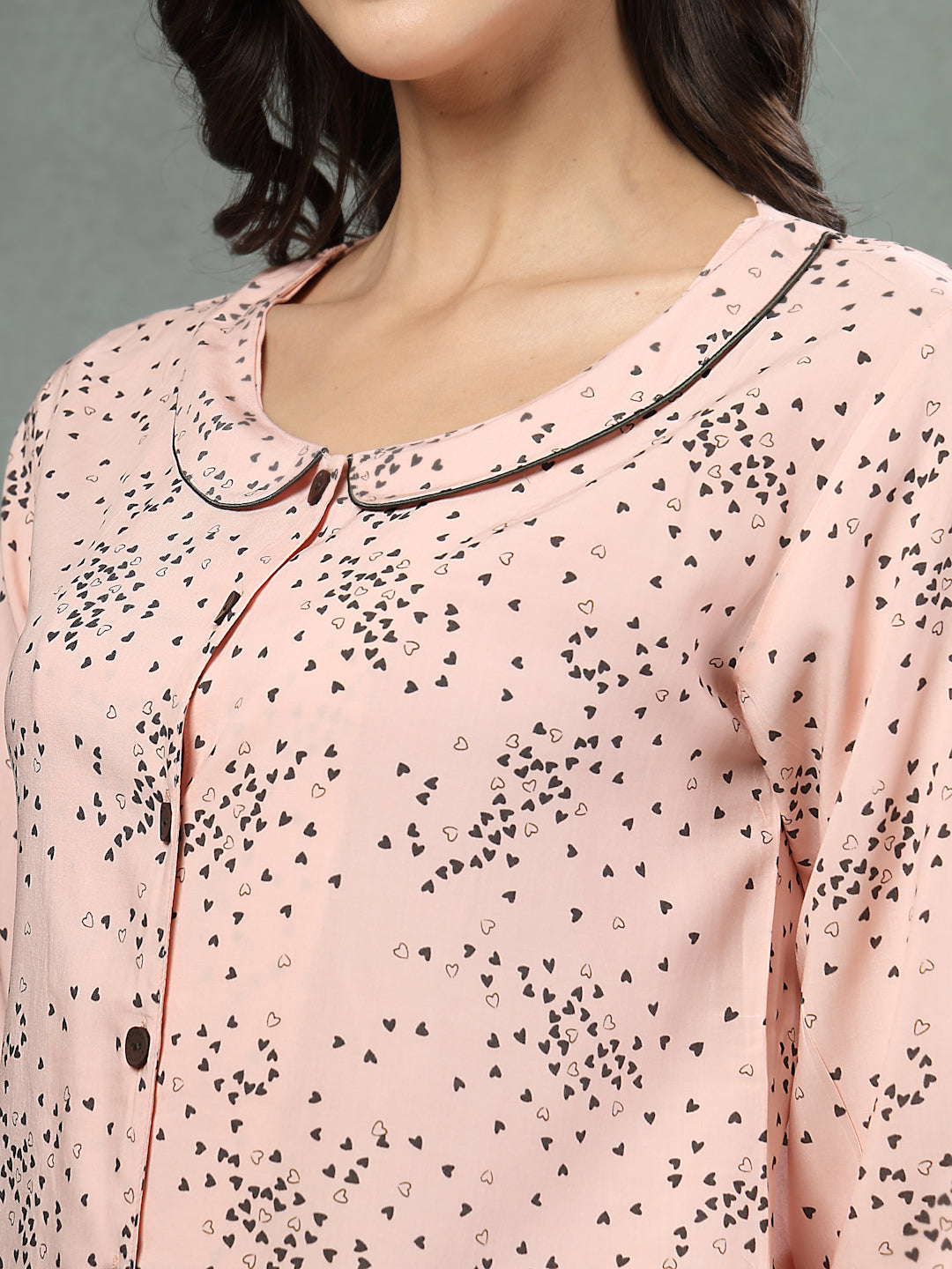 Crafted from breathable viscose, it features an all-over playful heart print that brings a sweet, relaxed vibe to your evenings. The shirt comes with a soft collar and elegant satin piping, giving it a refined finish while keeping things cozy. The matching bottoms are designed for ease, with two handy pockets and an easy fit that moves with you. It offers a gentle embrace for evenings and mornings, balancing softness with quiet elegance.