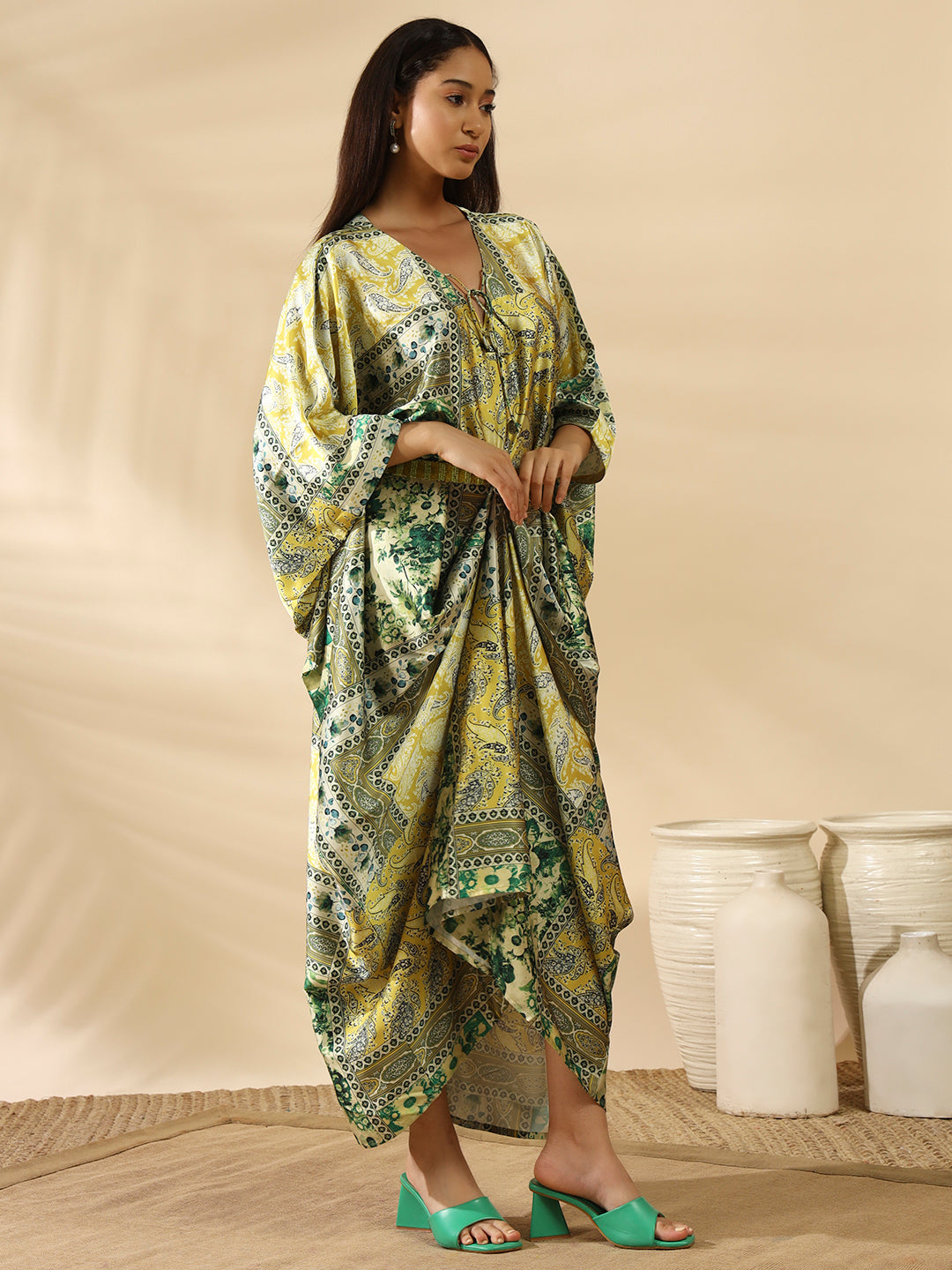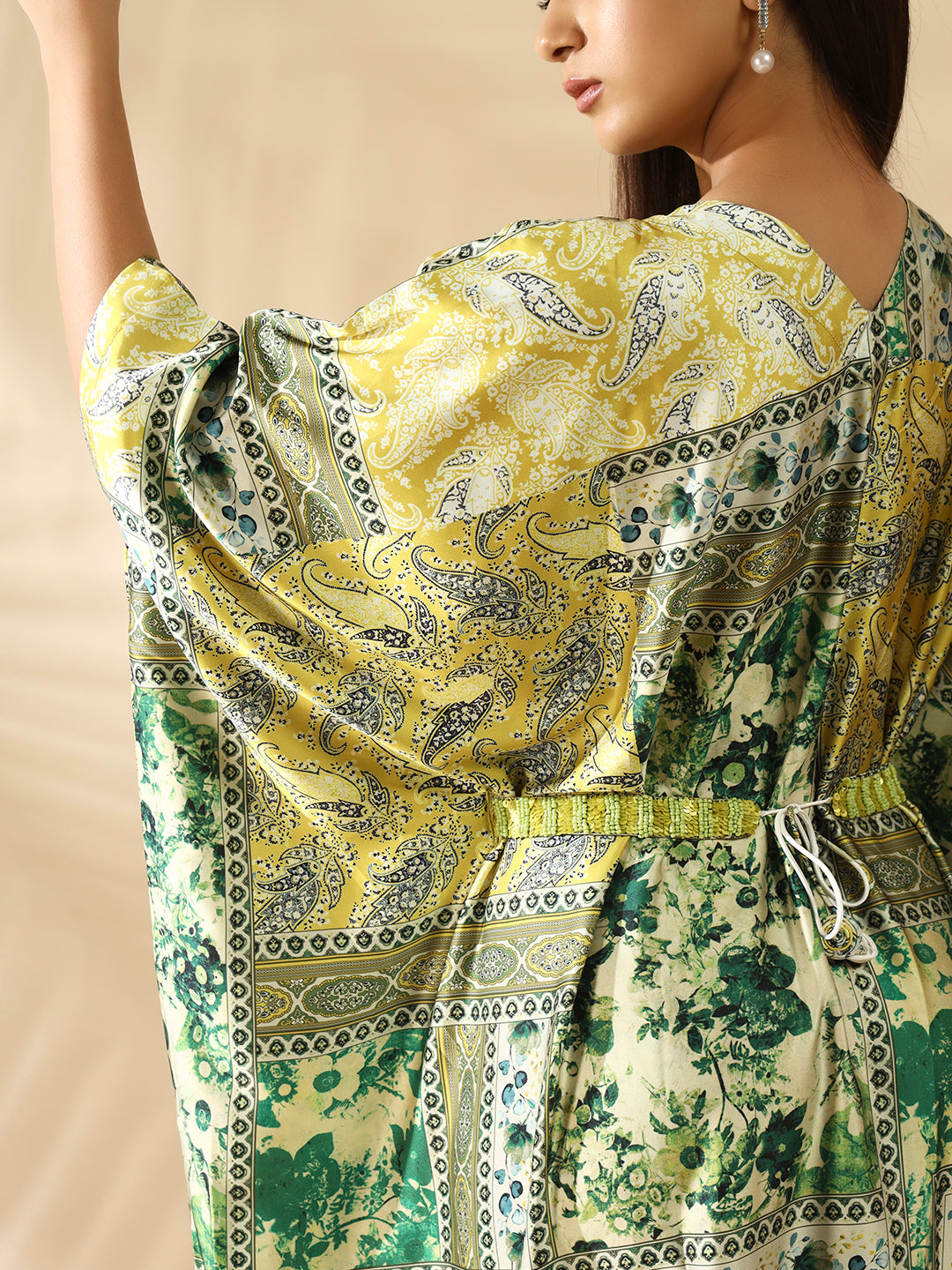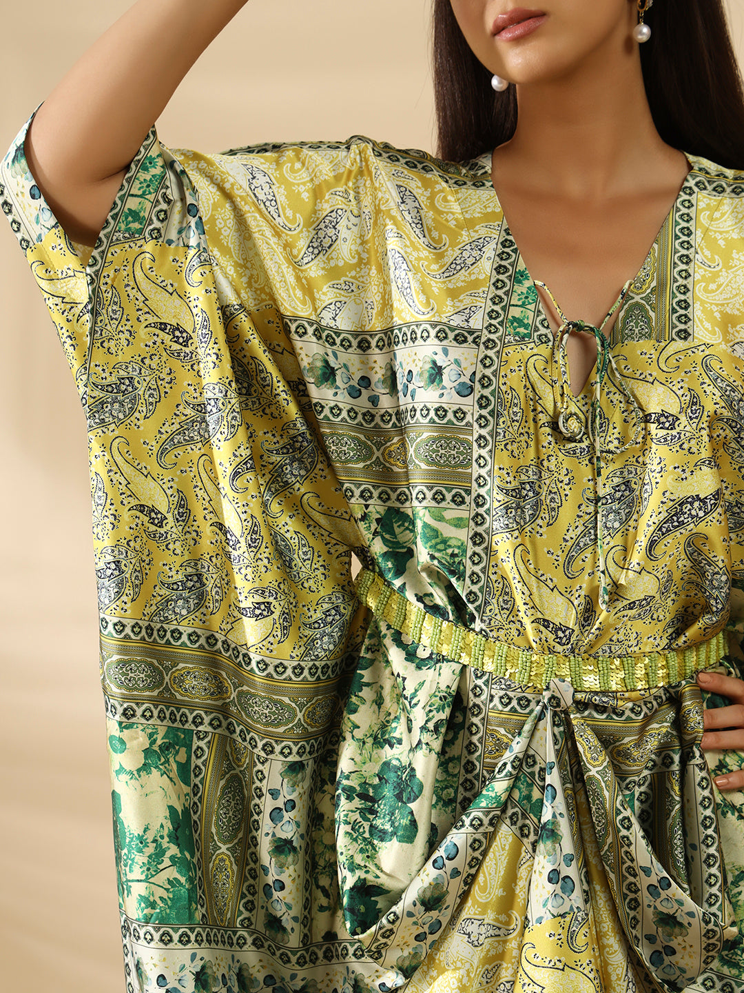 Some outfits whisper comfort while making a quiet statement, and this satin kaftan dress does exactly that. Made from smooth, skin-loving satin, this dress offers a lightweight touch that feels barely there, with enough drape to create movement and flow. The structured print panels give it a tailored visual rhythm while the wide sleeves and adjustable waist keep it relaxed and wearable. The result is a harmonious blend of comfort and design, made for savoring life's simple moments.