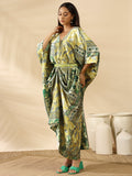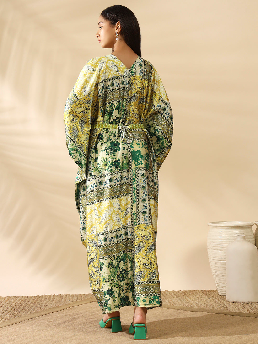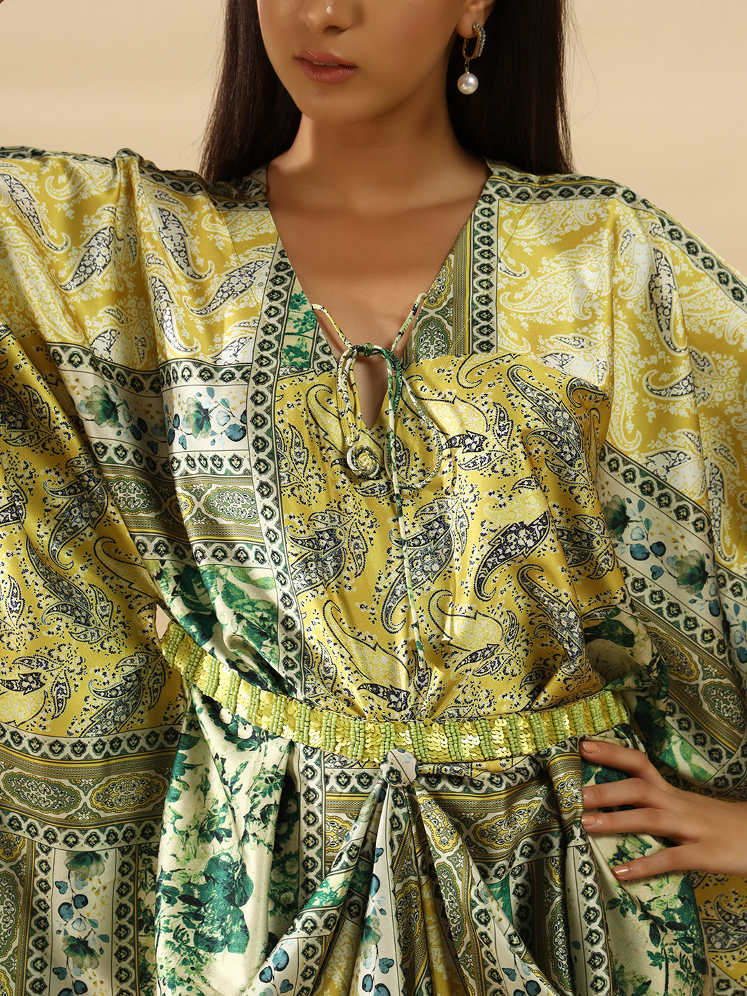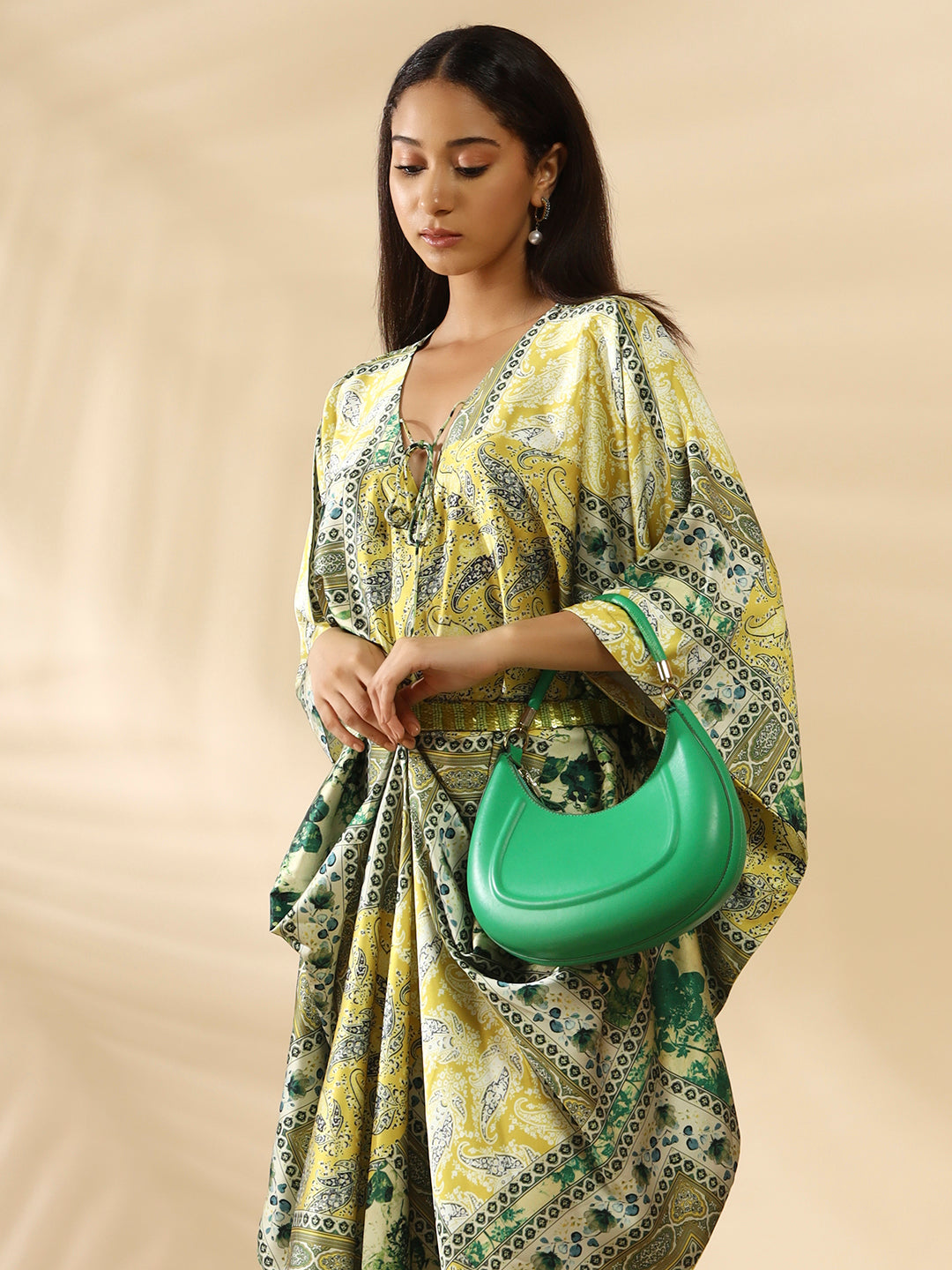 Some outfits whisper comfort while making a quiet statement, and this satin kaftan dress does exactly that. Made from smooth, skin-loving satin, this dress offers a lightweight touch that feels barely there, with enough drape to create movement and flow. The structured print panels give it a tailored visual rhythm while the wide sleeves and adjustable waist keep it relaxed and wearable. The result is a harmonious blend of comfort and design, made for savoring life's simple moments.