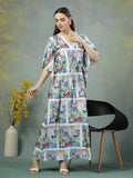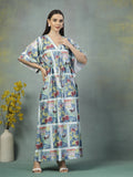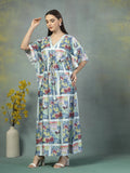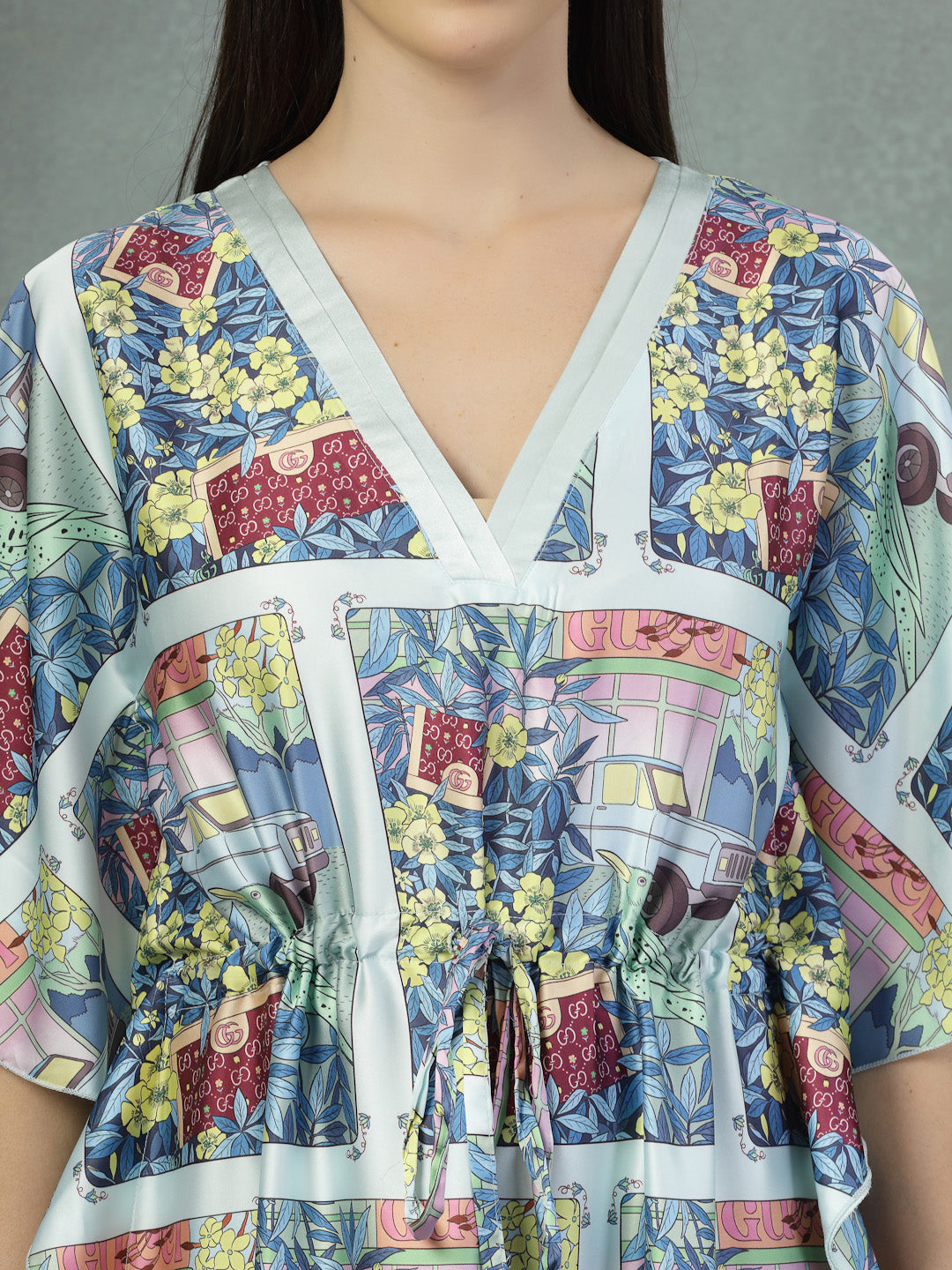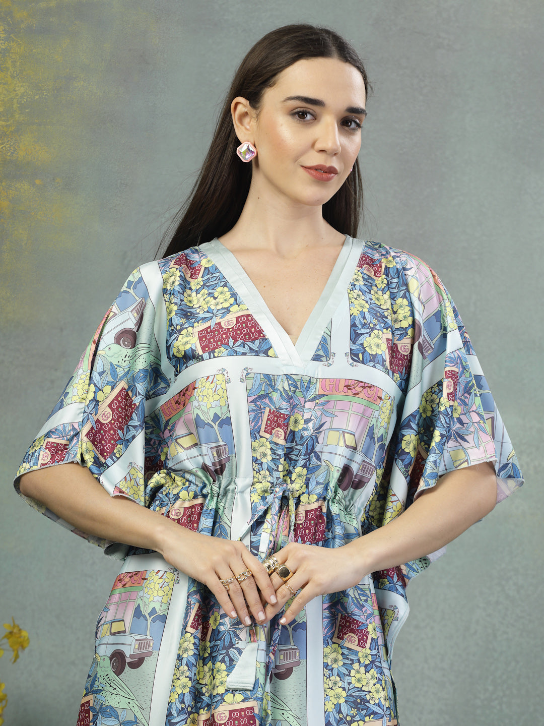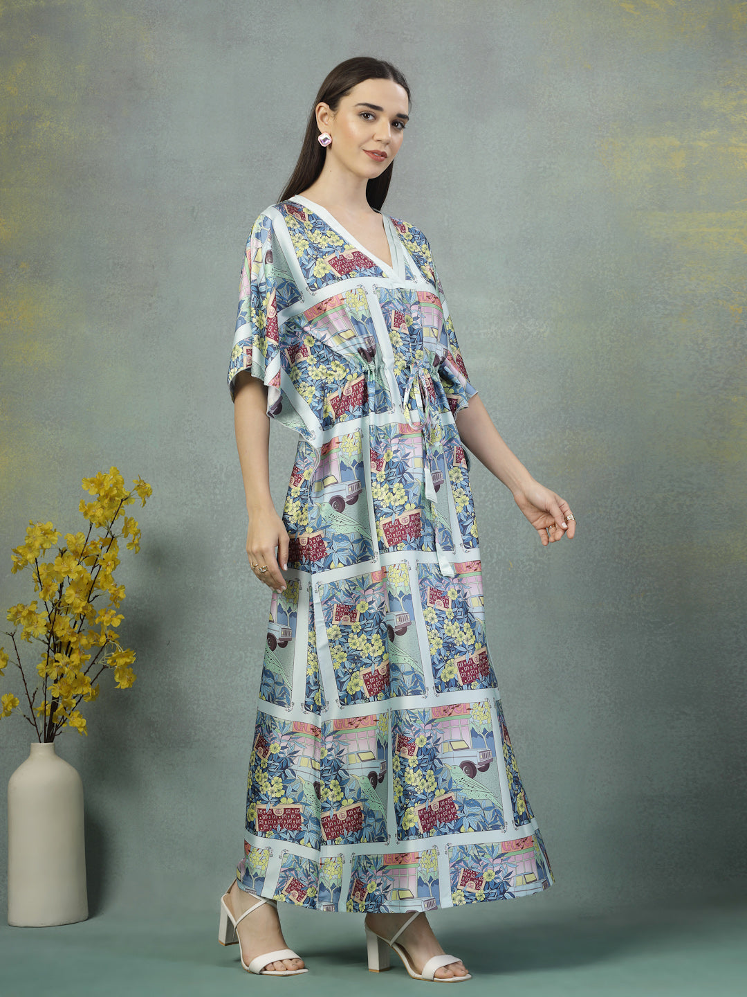 Let your wardrobe tell a story with this satin kaftan dress, thoughtfully designed to celebrate comfort and individuality. Crafted from skin-friendly satin lycra, the fabric feels incredibly soft against the skin and offers a graceful drape that flatters every form. The deep V-neckline and gently cinched waist create a balanced shape, while the wide sleeves and full length offer breathability and coverage in just the right measure. Refined comfort meets understated design.