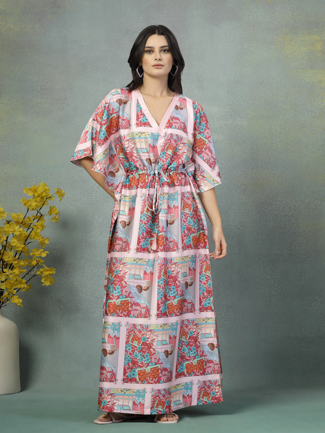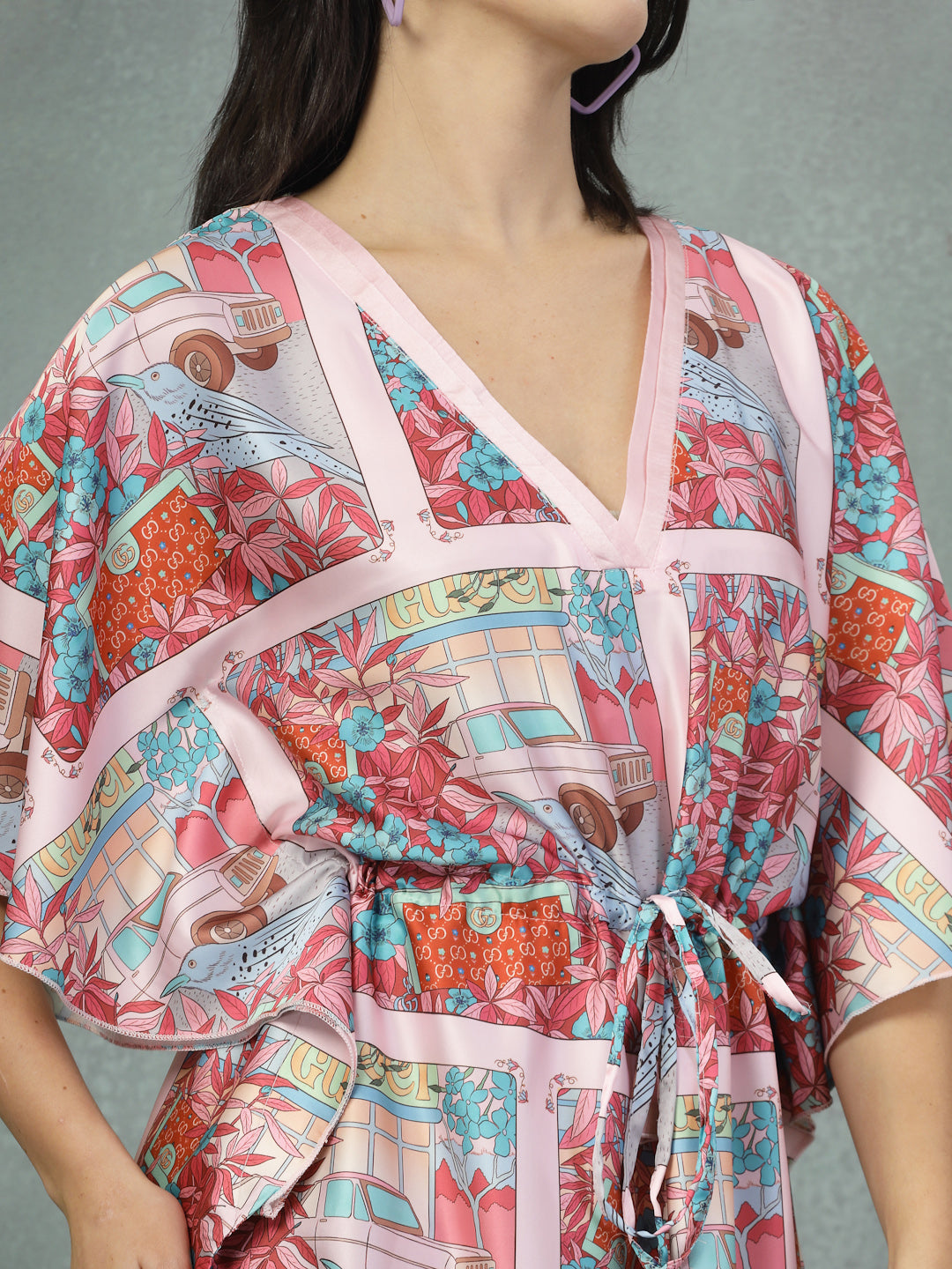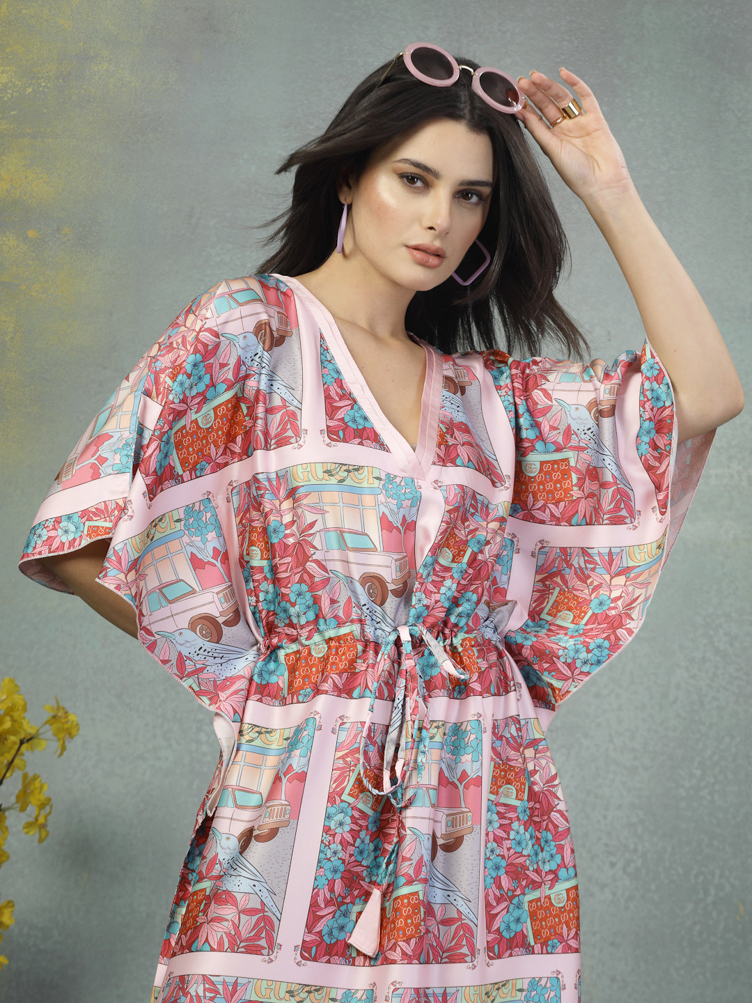 Bring a playful spirit to your everyday ease with this satin printed kaftan dress, crafted to offer flow, comfort, and a joyful burst of color. The lightweight satin fabric is smooth on the skin and offers a subtle sheen that catches the light with every movement. A drawstring tie at the waist lets you adjust the fit to your liking, whether you want to wear it loose and easy or gently cinched for a more defined shape.