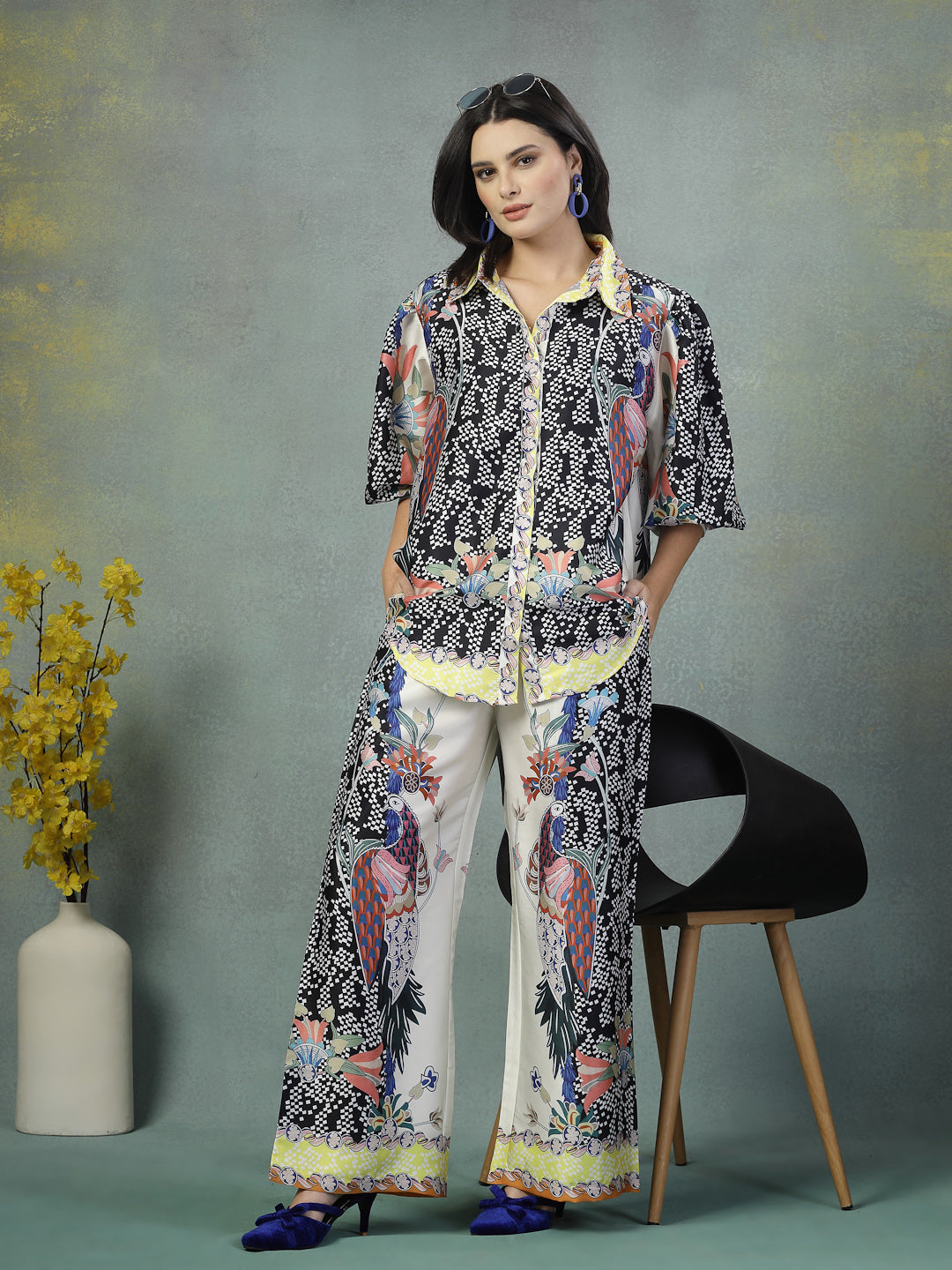 The top boasts a contemporary silhouette that flatters without clinging, while the lower provides just the right amount of ease for lounging, sleeping, or stepping out for a quick errand. What truly sets this piece apart is the designer-inspired print that adds a touch of drama and distinction to your everyday rituals.