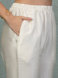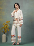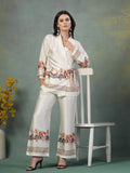 Made from lustrous satin lycra, this set features a creamy ivory base adorned with a vibrant, intricate print of traditional motifs adding a touch of cultural artistry. The smart overlapping gown top is designed with a wrap-style front, secured with a matching tie belt that cinches the waist for a flattering silhouette. Its wide, three-quarter sleeves offer a breezy yet refined look.
